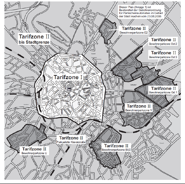 In designated areas, it is compulsory to buy a parking ticket for parking. There are two different tariff zones in Aachen. The distinction between tariff zones 1 and 2 can be seen on this map.