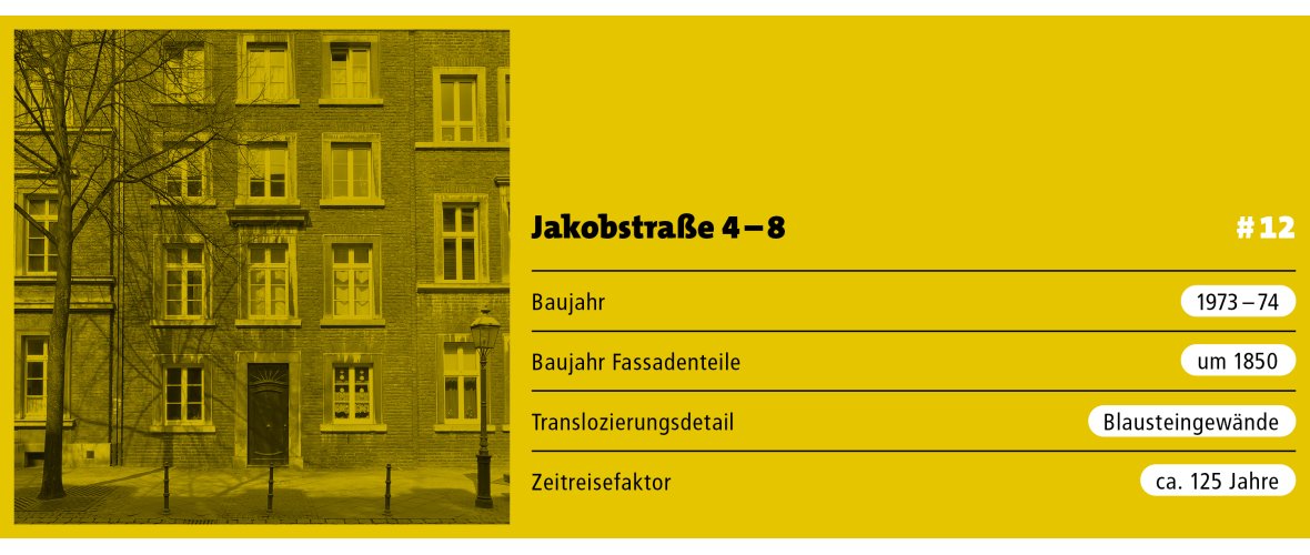 The houses at Jakobstraße 4-8 were built between 1973 and 1974. The façade sections date from around 1850 and the blue stone walls are important translocation details. The time travel factor of the monument is approx. 125 years.