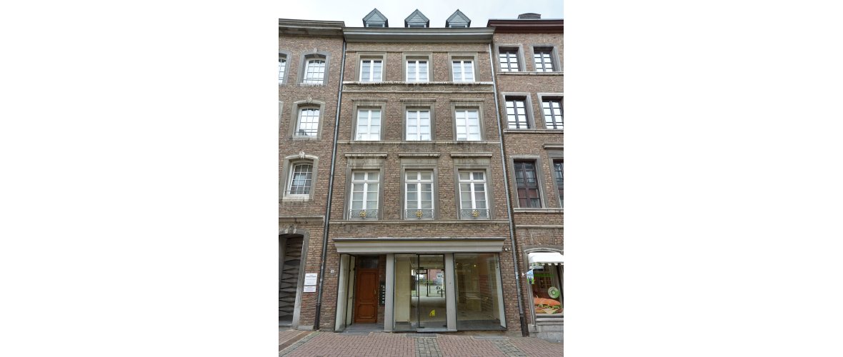 According to Hugot's notes, the façade of the house originates from Pontstraße, or more precisely from the former Pontstraße 1 b. The three upper storeys were dismantled and inserted here in a slightly different form: a sturdy cornice on the second floor was inserted above the stone relief on the second floor. The projecting element better protected the relief from the weather. The stone band that was originally there was inserted under the windows of the new second floor instead. The first floor of the old building had already been altered, which is why it was also left open and designed with two load-bearing concrete supports.