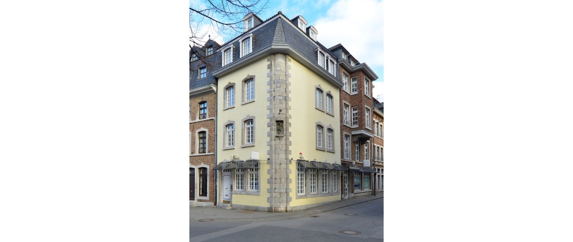 In house no. 8, the existing four-axis window structure of the first floor was reused. Instead of simple upper floor windows, the building yard installed blue stone walls and both upper floors were raised by approx. 50 cm. The pitched roof was replaced by a high mansard roof, which made significantly more living space possible. At no. 10, the striking corner bracing with figure niche, which originates from a demolished building from 1738 on Klosterbongard, is particularly striking. Further jambs came from Eilfschornsteinstraße and presumably from Burtscheid.