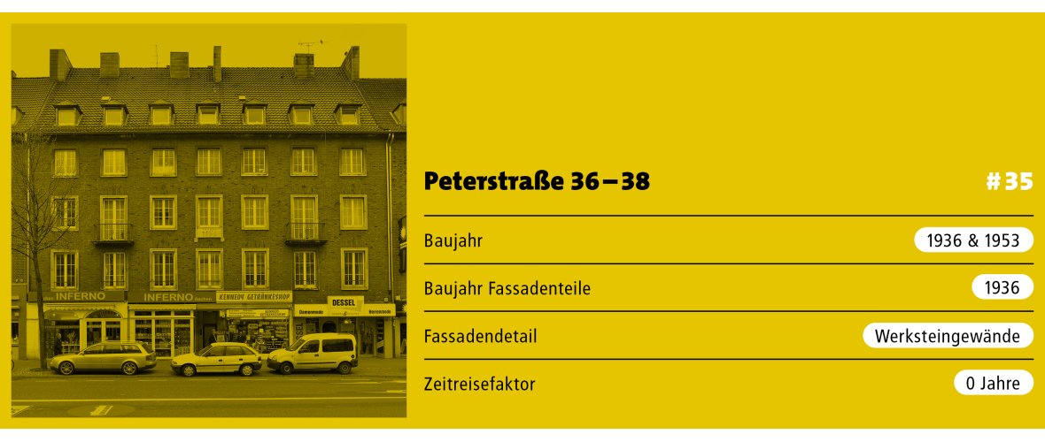 The old district here was not only cramped and neglected in the 1920s. It was also regarded as a "shelter for immoral trades, criminals and communists" (Moritz Wild: Architekturlehre und Städtebau im Regierungsbezirk Aachen, p. 120) and thus gave the city administration of the time cause to comprehensively renovate the district. The originally very small-scale historic buildings on this site were demolished in the 1930s and replaced by the current building no. 36-38. According to the inscription on the façade, it was largely completed in 1936. The building suffered considerable damage during the Second World War and was burnt down to the outer walls and staircase. It was restored in 1953.