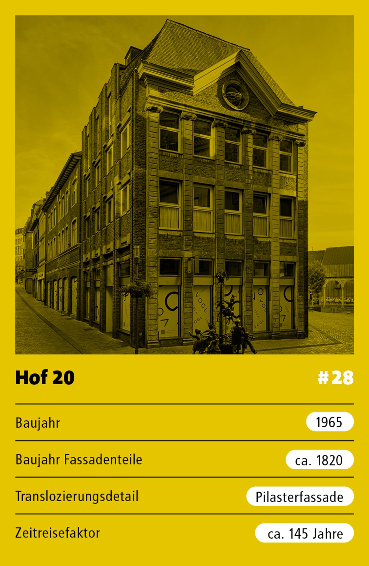 Le bâtiment d'angle Hof Nr. 20 se trouve à proximité de la cathédrale d'Aix-la-Chapelle, inscrite au patrimoine mondial de l'humanité. Ses environs font partie des plus anciennes zones d'habitation d'Aix-la-Chapelle et séduisent encore aujourd'hui par leur petite taille, leurs nombreux bâtiments historiques et ceux qui, en tant que nouvelles constructions, s'intègrent bien dans le contexte urbain. Le bâtiment Hof 20 en est un exemple parfait.