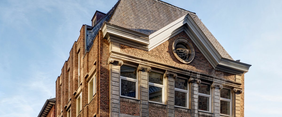 Le bâtiment attire directement l'attention par sa remarquable façade en pilastres de pierre bleue, qui est unique à Aix-la-Chapelle en raison de sa conception cohérente sur trois étages. Les deux nouvelles façades latérales ont été conçues de manière moderne avec des éléments en béton qui ressemblent presque à une modification subtile et simplifiée de la façade principale historique. De cette manière, l'attention est habilement attirée sur la façade principale.
