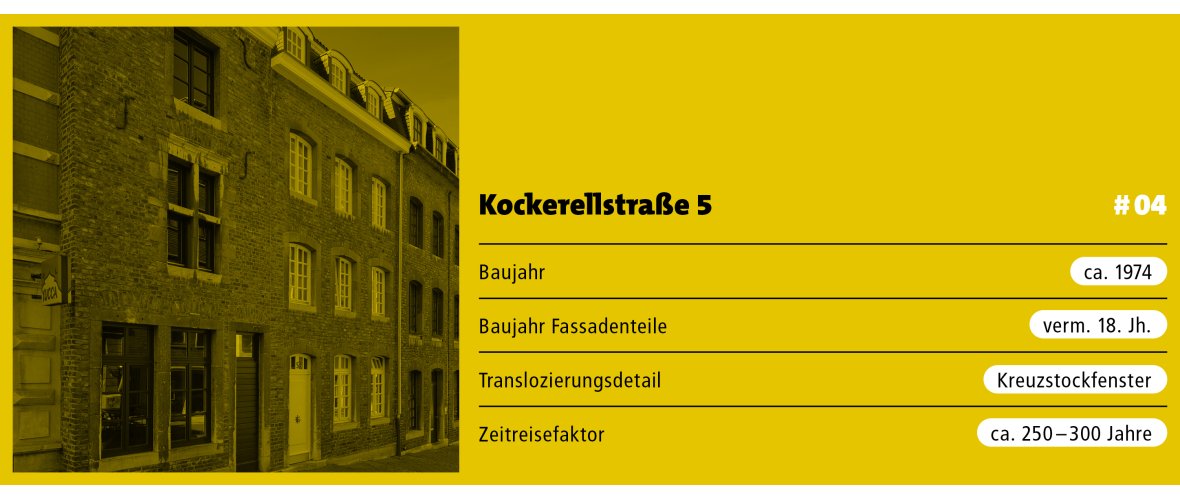 Lors de la démolition du bâtiment Kockerellstraße 5, les montants de la façade à un seul axe ont été stockés et replacés dans le nouveau bâtiment. Le socle a été abaissé de manière à ce que tous les jambages se trouvent environ 30 cm plus bas. Le croisillon manquant de la fenêtre de l'étage supérieur a été reconstruit. Grâce aux trous et aux agrafes sur les murs du rez-de-chaussée, on peut deviner que ces pierres ont été réutilisées plusieurs fois. La façade droite aux formes baroques présente nettement moins de détails "historiques" que la partie gauche.