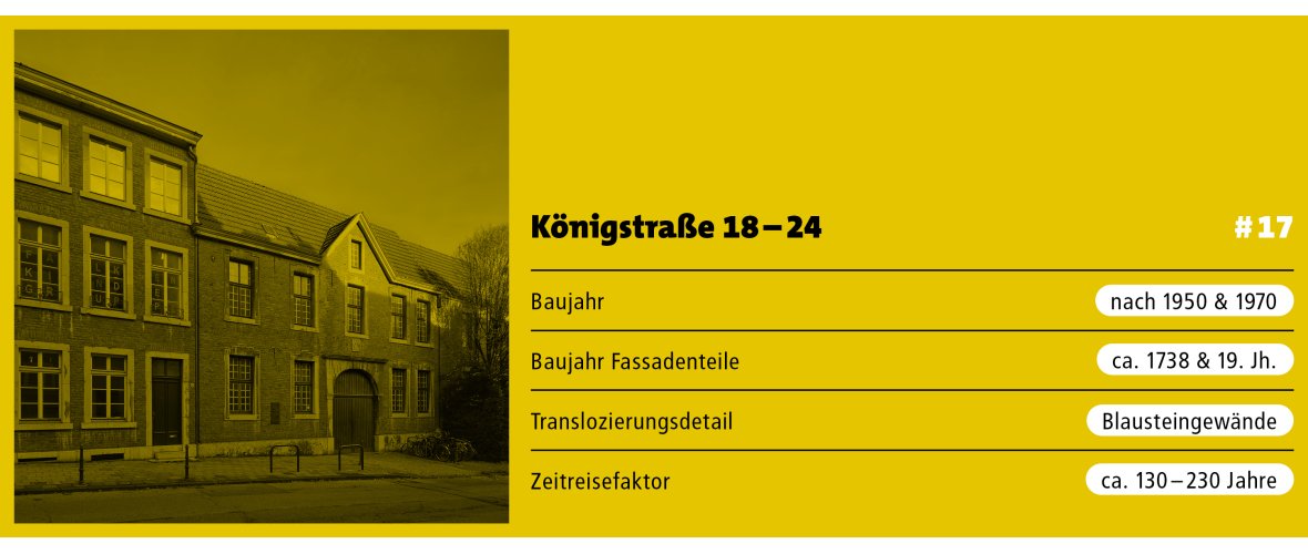 La maison des numéros 18-22 de la Königstraße, qui se distingue par son pignon et sa porte cochère, est attribuée à l'architecte baroque d'Aix-la-Chapelle Laurenz Mefferdatis. Construit en 1738, le bâtiment a été fortement endommagé pendant la Seconde Guerre mondiale. Pour la construction d'un nouveau gymnase scolaire, le service des bâtiments de la ville d'Aix-la-Chapelle a décidé d'enlever les restes de la façade et de les intégrer dans le nouveau bâtiment en tant que reconstruction. Contrairement à la façade Wespien (Kockerellstr.), la nouvelle construction du gymnase est ici entièrement cachée côté rue.