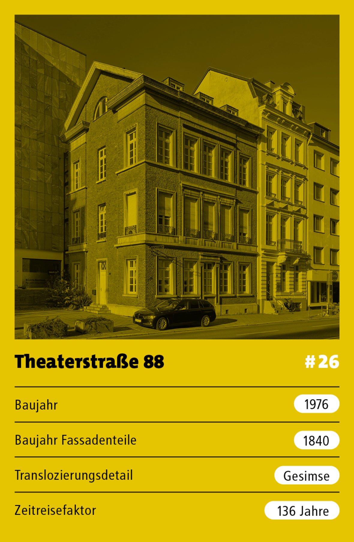 Après avoir été stockés pendant trois ans dans la cour de construction, les éléments de la façade ont été placés devant le nouveau bâtiment sur le terrain du n° 88. Les proportions et la structure de la façade s'orientent vers le bâtiment d'origine et sont en grande partie fidèles à l'original. Les surfaces crépies qui existaient auparavant ont été supprimées. Les portes déjà murées auparavant ont été refaites de la même manière. En revanche, le pignon triangulaire donnant sur la rue de l'association et la corniche d'avant-toit et de pignon nettement plus prononcée sont des ajouts récents.