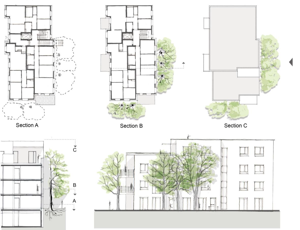 L'étude d'une équipe de recherche interdisciplinaire, sur la mise en œuvre d'un projet pilote à Bamberg avec des façades d'arbres, a été utilisée lors de la planification pour la mise en œuvre des arbres proches des façades prévus ici. L'étude a analysé à quelle distance et dans quelles conditions un arbre peut être planté sur une façade.