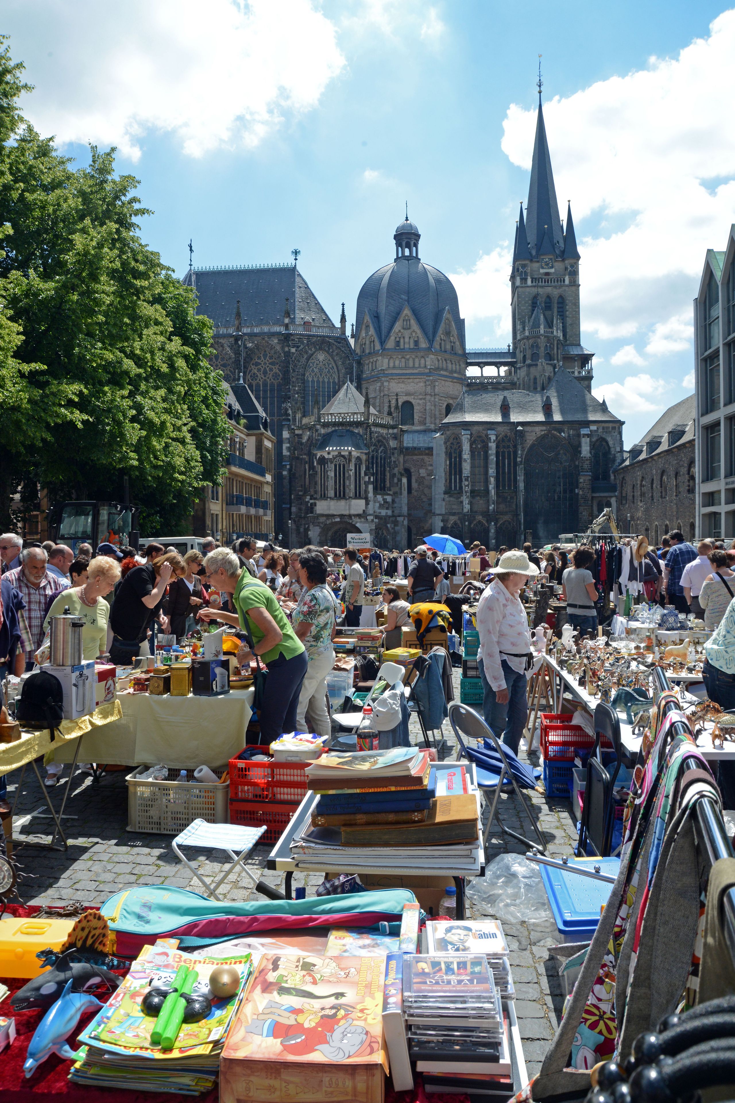 Brocante entre la cathédrale et l'hôtel de ville. Quatre fois par an, le décor entre la cathédrale et l'hôtel de ville crée de la place pour le marché aux puces de la vieille ville. Une brocante particulière au cœur d'Aix-la-Chapelle.