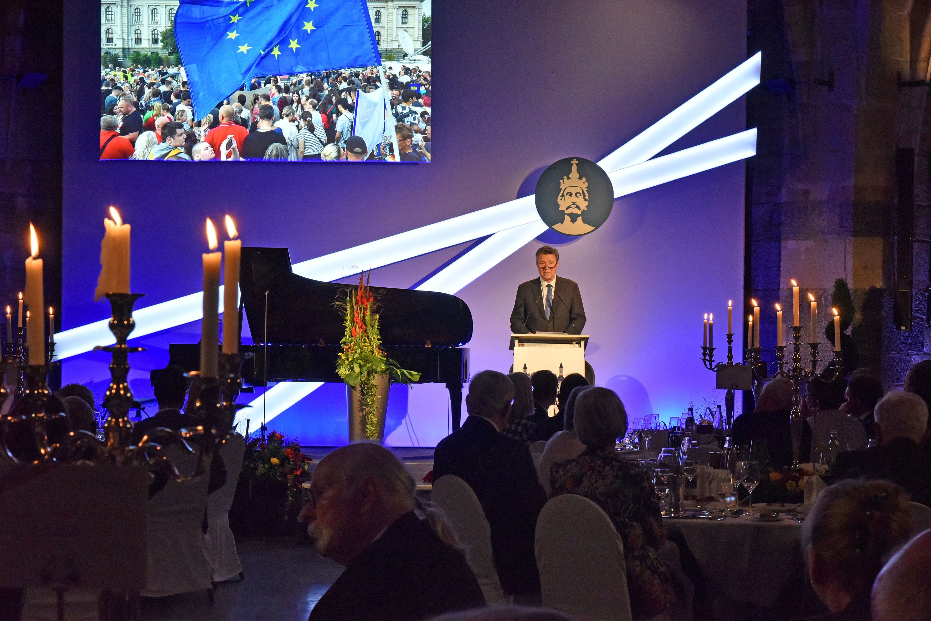 L'orateur principal, le Dr Géza Andreas von Geyr, chef de la représentation permanente auprès de l'OTAN et représentant permanent de l'Allemagne au Conseil de l'Atlantique Nord, a placé la sécurité de l'Europe et les valeurs européennes au centre de son discours lors du 21ème repas du couronnement d'Aix-la-Chapelle dans la salle du couronnement de l'hôtel de ville d'Aix-la-Chapelle, devant environ 200 invités.