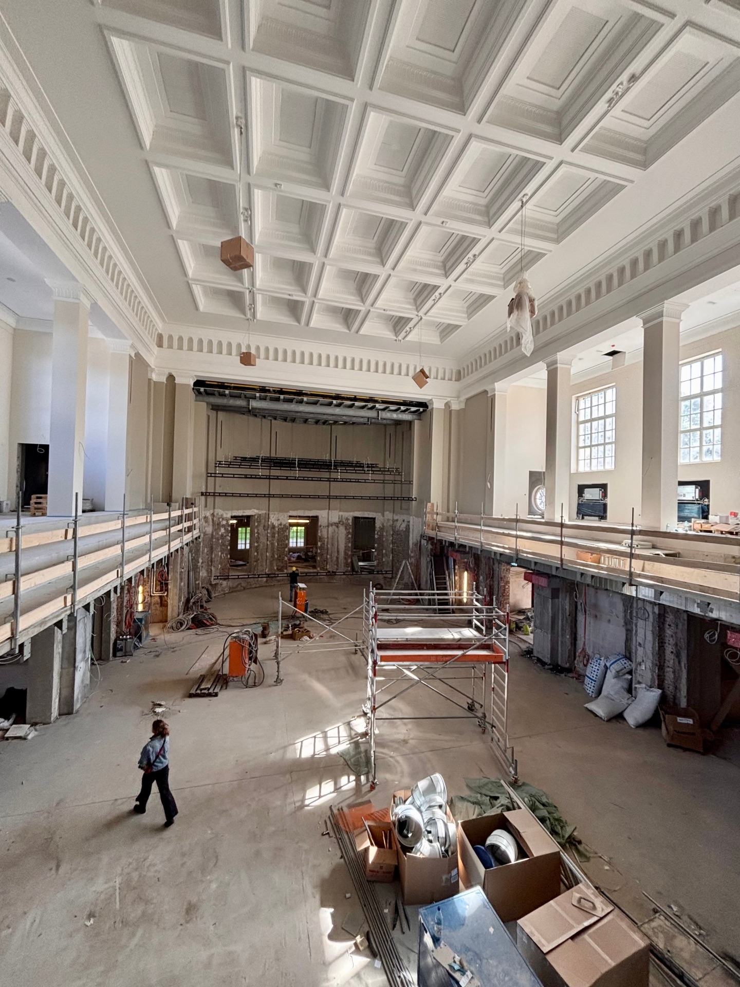Au cours des dernières années, les installations brutes ont progressé dans une phase qui a pris beaucoup de temps. Dans le domaine des corps de métier techniques, il a fallu installer à grands frais des gaines de ventilation et les grands appareils de ventilation correspondants, des kilomètres de lignes électriques, des conduites de chauffage et de refroidissement ainsi que de nombreuses conduites de médias pour la future utilisation en tant que bâtiment événementiel. Actuellement, ce sont les travaux de second œuvre qui s'activent dans le nouveau centre thermal. Ainsi, les surfaces murales sont réappliquées et peintes. En effet, au début de la rénovation, les anciens enduits ont dû être presque entièrement retirés et éliminés dans le cadre d'une décontamination. Les plafonds sont également en cours de finition avec des plafonds suspendus et des voiles de plafond acoustiques. Les sanitaires seront recouverts de carrelage. Des travaux de carrelage sont également en cours dans les cages d'escalier. Des travaux de parquet et de pierre naturelle sont prévus prochainement, comme l'ont indiqué les architectes Holler et Schumacher.