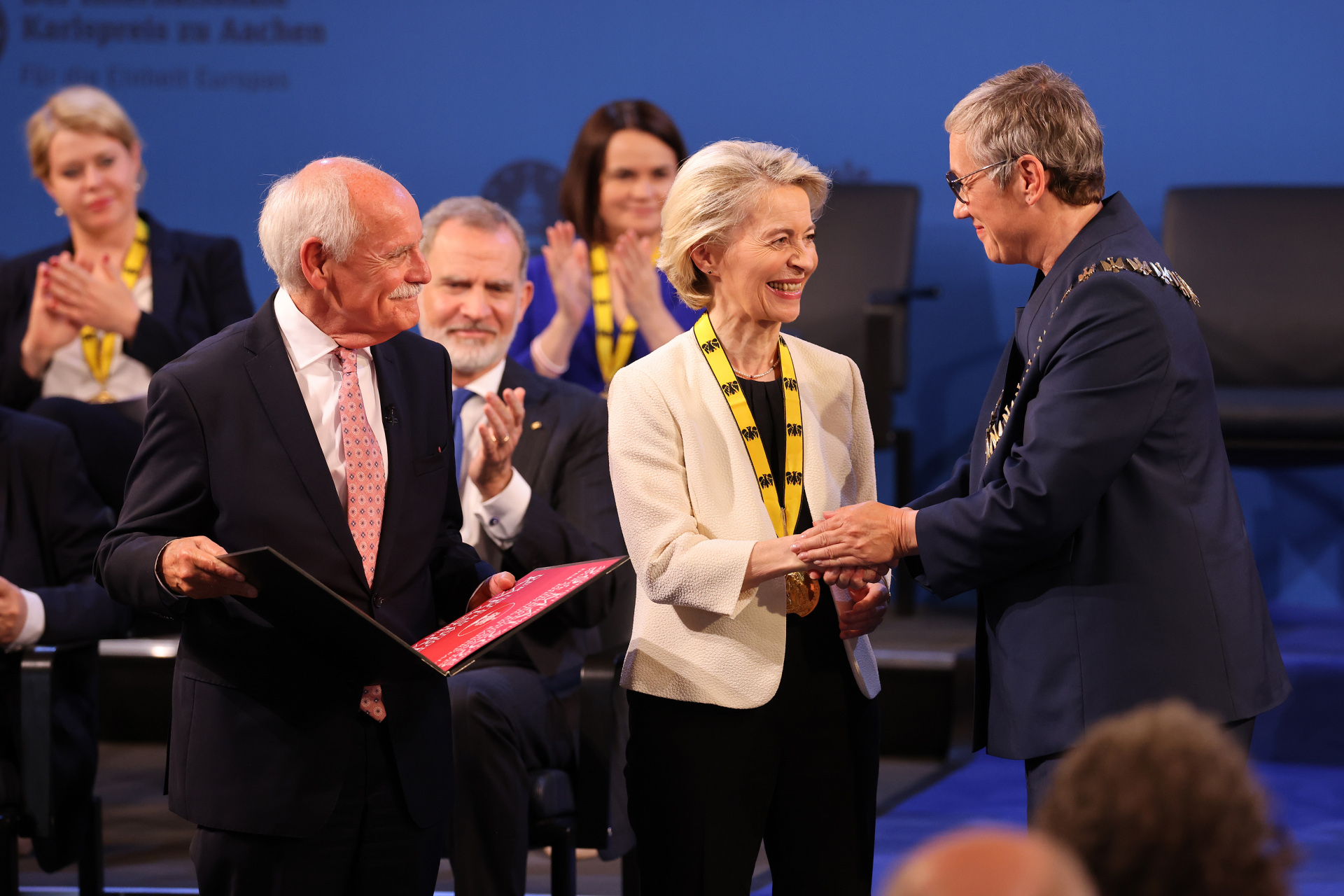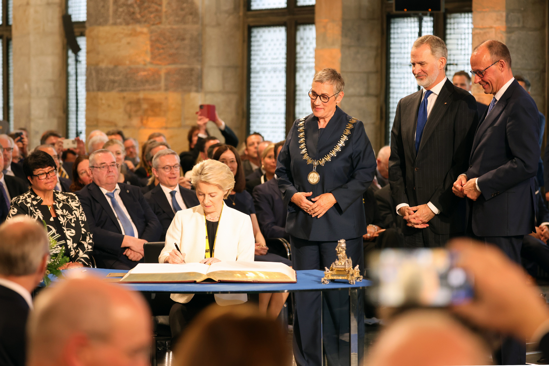 - La cérémonie : environ 700 personnes, dont de nombreux invités d'honneur, des élus*, des ambassadeurs* et des représentants d'églises et de communautés religieuses, ont participé aux festivités dans la salle du couronnement de l'hôtel de ville d'Aix-la-Chapelle. Sur le podium d'honneur se trouvaient, aux côtés de la lauréate du prix Charlemagne Ursula von der Leyen, le chancelier fédéral Friedrich Merz, le roi Felipe VI d'Espagne, la maire de la ville d'Aix-la-Chapelle Sibylle Keupen, le président du directoire du prix Charlemagne Dr. Jürgen Linden, des représentants des lauréats du Prix Charlemagne pour la jeunesse de cette année, les anciens lauréats du Prix Charlemagne* Dahlia Grybauskaité (2013), Jean-Claude Trichet (2011) et Martin Schulz (2015) ainsi que les lauréats de l'année 2022 Veronica Tsepkalo, Svetlana Tichanovskaya et - en remplacement de sa sœur emprisonnée Maria Kalesnikava - Tatsiana Khomich.
