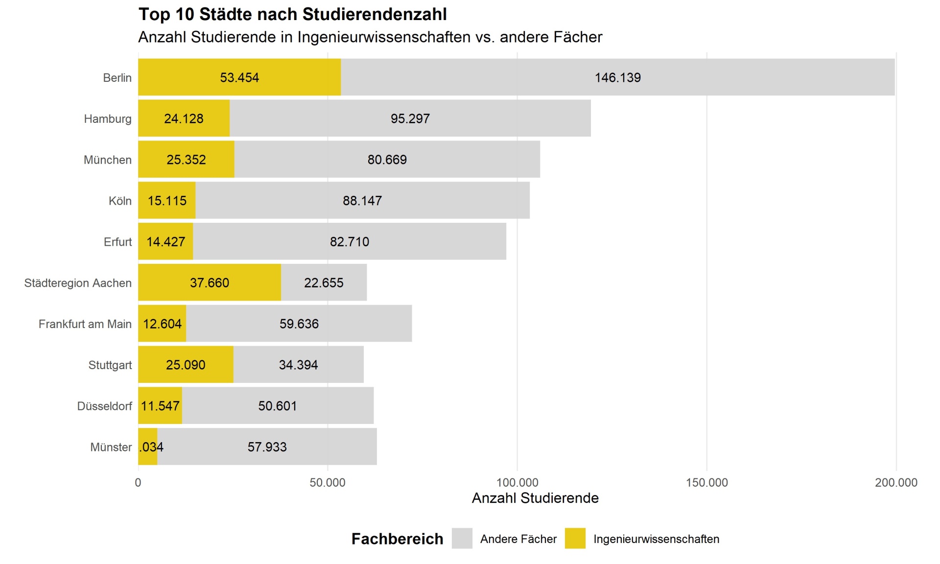 Le nombre total d'étudiants dans la région urbaine d'Aix-la-Chapelle, y compris le site de recherche de Jülich, s'élevait à 60 315 au semestre d'hiver 2022 selon Destatis, ce qui place la région à la 9e place en comparaison nationale. Si l'on considère uniquement les sciences de l'ingénierie, seul Berlin présente un nombre d'étudiants plus élevé. Cela montre clairement l'importance des étudiants en ingénierie pour le site d'études d'Aix-la-Chapelle.