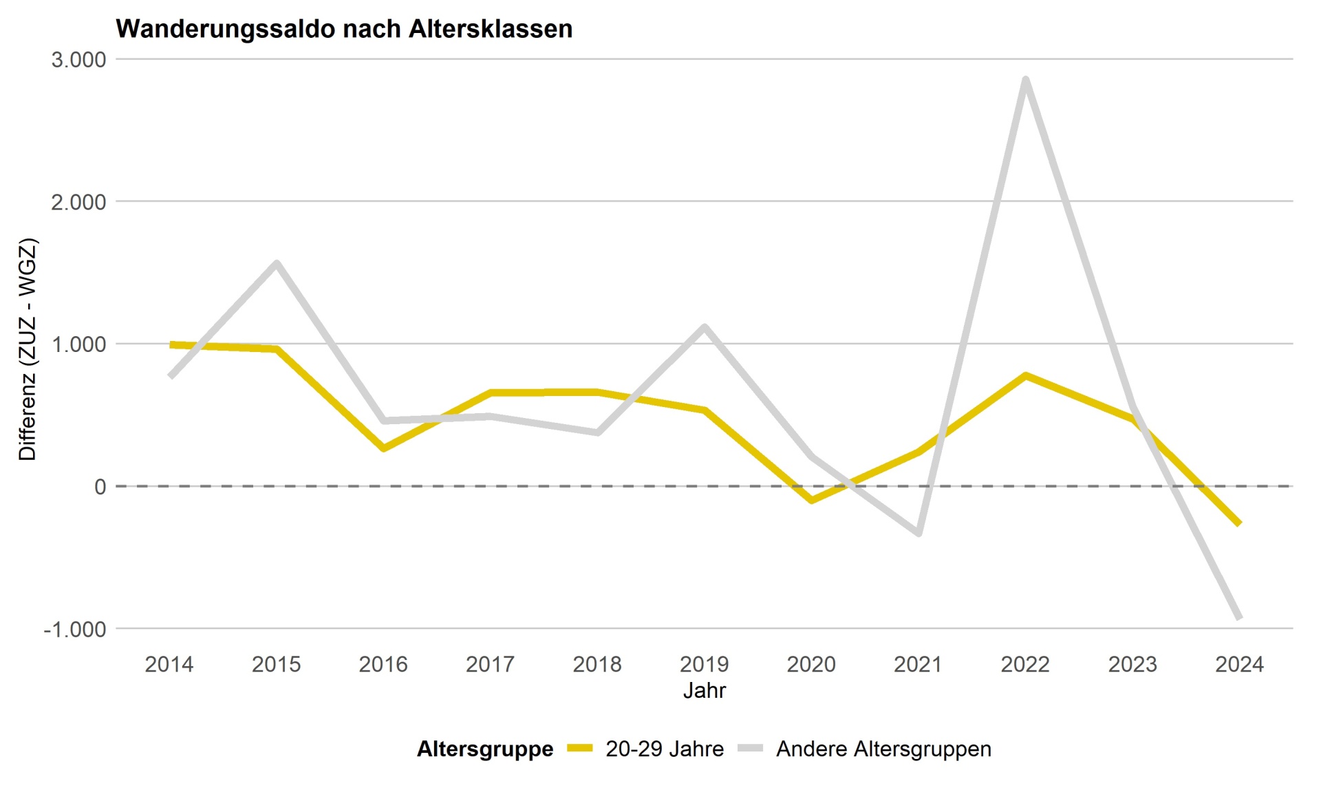 Les étudiants ont également une influence clairement mesurable sur les arrivées et les départs à Aix-la-Chapelle. Entre 2014 et 2024, le nombre moyen d'arrivées chez les personnes âgées de 20 à 29 ans était de 9 990 et le nombre moyen de départs de 9 518. Bien que cette tranche d'âge ne représente que 23% de la population totale selon le recensement, l'ensemble du reste de la population de la ville d'Aix-la-Chapelle présente des chiffres à peine plus élevés. Ici, on a enregistré en moyenne 10 710 arrivées et 10 063 départs. Le solde migratoire (arrivées - départs) montre une image similaire. La moyenne est de 472 pour la tranche d'âge de 20 à 29 ans et de 647 pour toutes les autres tranches d'âge. Le graphique ci-dessous présente les valeurs annuelles. On voit ici que le solde migratoire a baissé pour les deux groupes depuis 2014. En 2020 et 2024, le solde migratoire était négatif, sinon il était toujours positif.