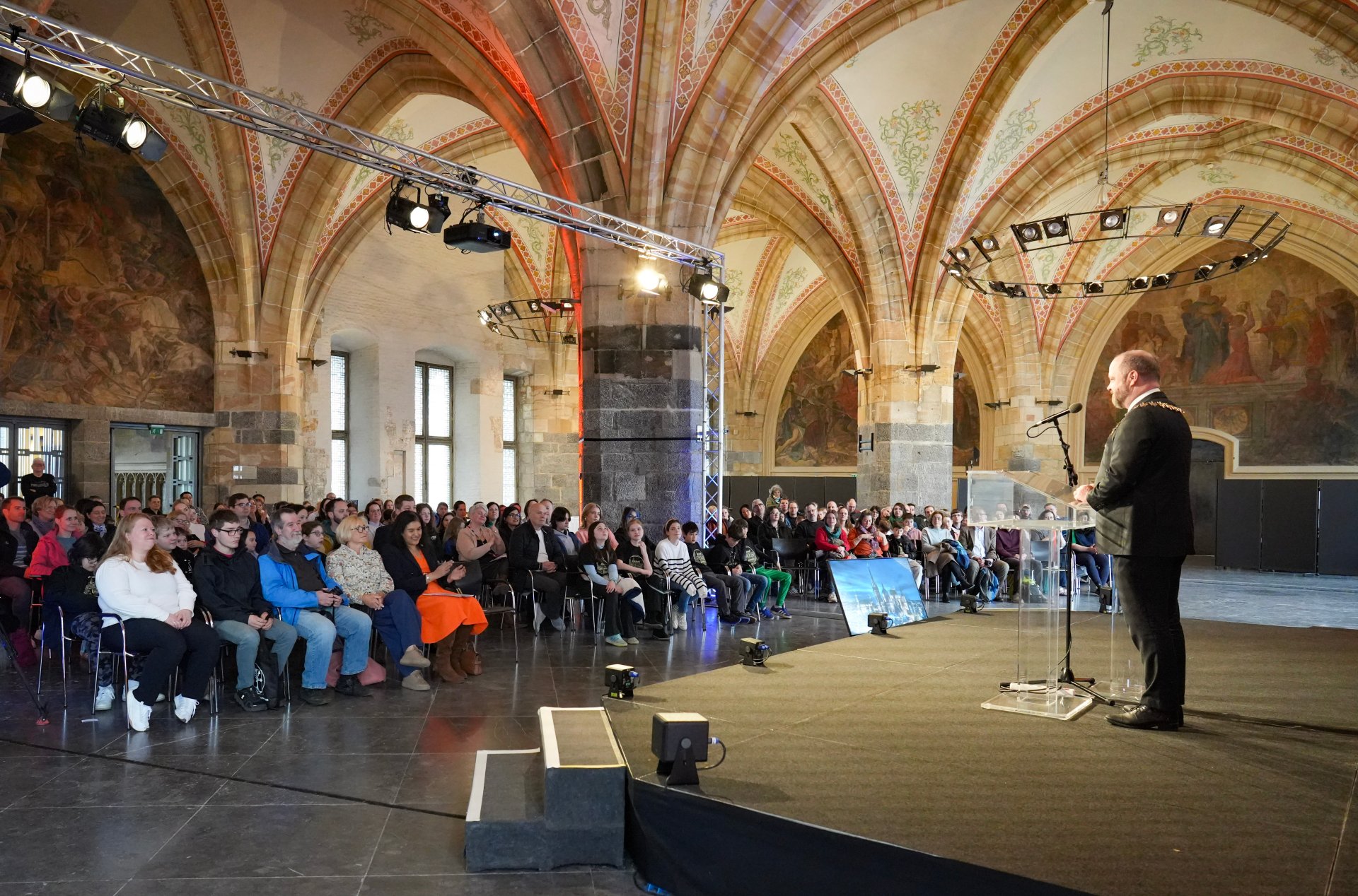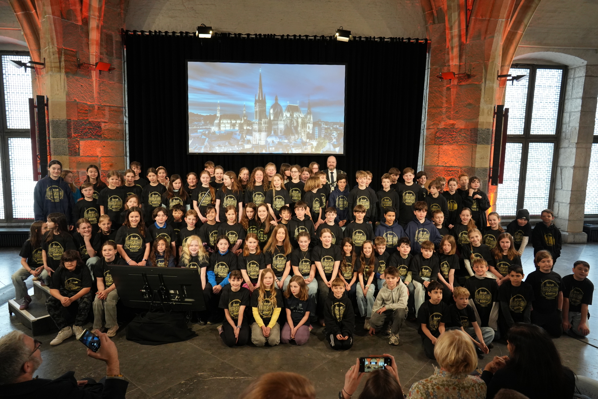 Salle comble dans la salle du couronnement de l'hôtel de ville d'Aix-la-Chapelle. Là où les rois étaient autrefois couronnés et où, plus récemment, le prix international Charlemagne est décerné, de nombreux jeunes d'Aix-la-Chapelle et de la ville jumelle américaine d'Arlington sont assis ce lundi matin 30 mars.