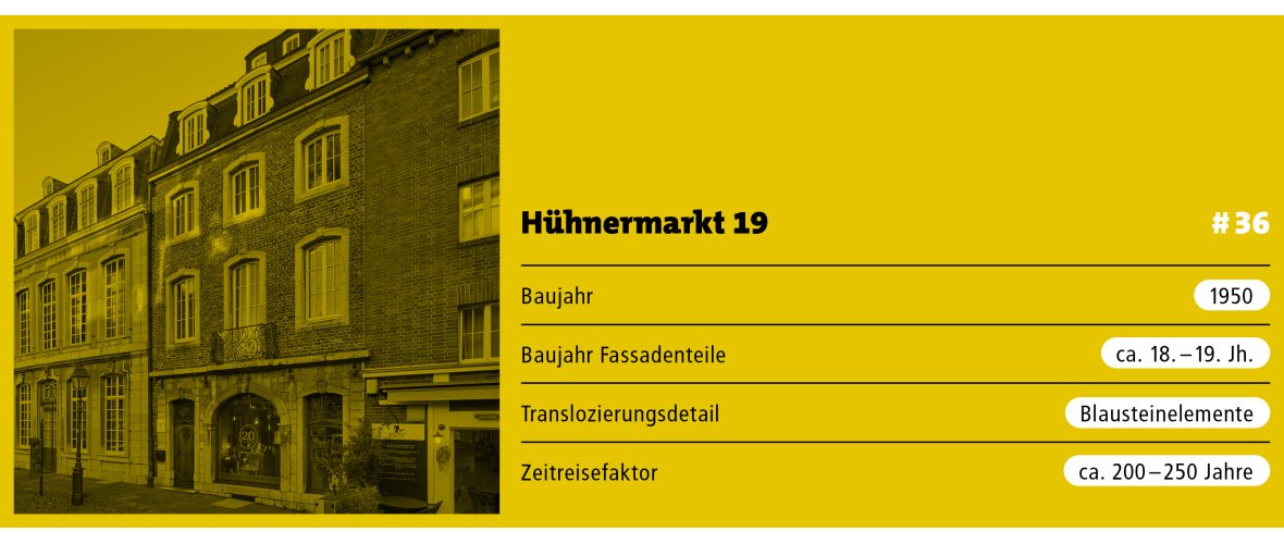 Het huis aan de Hühnermarkt 19 is gebouwd in 1950. De geveldelen dateren van rond de 18e tot 19e eeuw. Belangrijke translocatiedetails zijn de arduinen elementen. De tijdreisfactor van het monument is ongeveer 200-250 jaar.
