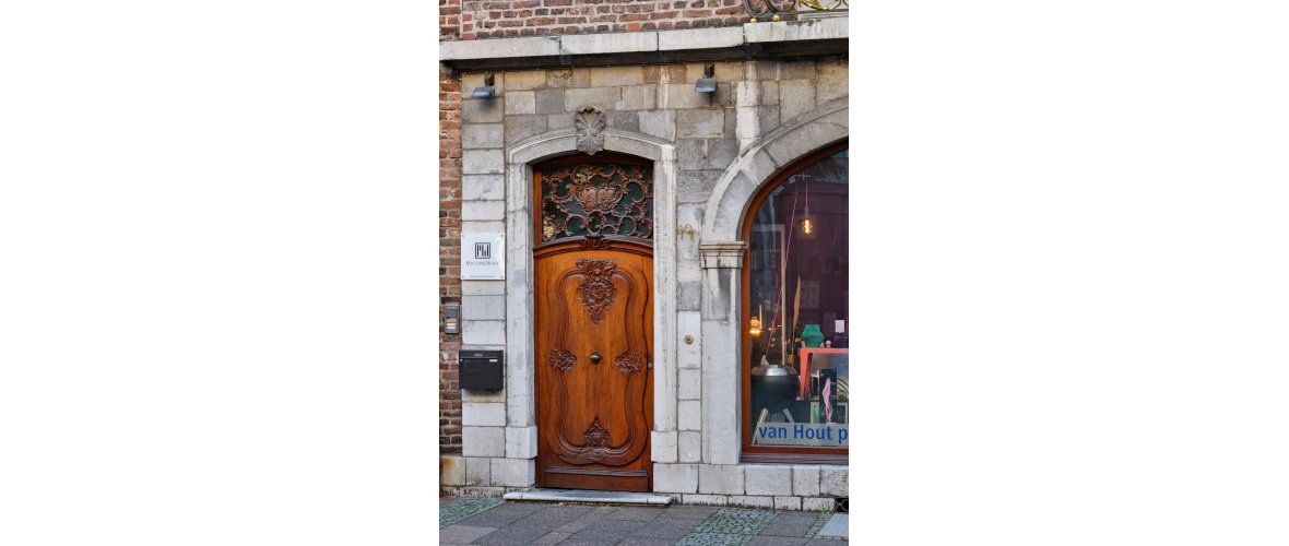 Lüttgens ontwierp de gevel van zijn huis met arduinen elementen van andere oude gebouwen die waren verwoest, net zoals de stad Aken tien jaar later op grote schaal zou doen. Delen van de gevel kwamen uit het huis op Krugenofen 15-17. Mogelijk werden ook een balkon uit de Franzstraße 8 en de voordeur van de Bahnhofstraße 22 hergebruikt. De ontbrekende vensterbanken op de begane grond, de verschoven stenen aan de voet van de voordeur en de boogvorm van de etalage laten zien dat materialen opnieuw werden gecombineerd en aangepast.