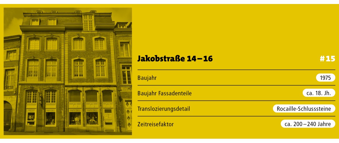 Het huis aan de Jakobstraße 14-16 werd gebouwd in 1975. De geveldelen dateren uit de 18e eeuw. De rocaille sluitstenen zijn belangrijke translocatiedetails. De tijdreisfactor van het monument is ongeveer 200-240 jaar.