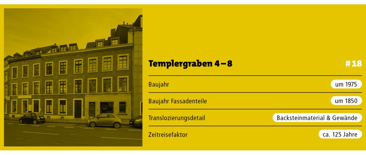 Templergraben, als onderdeel van de ringvormige verkeersroute rond de oude stad, had hier een knelpunt dat moest worden verbeterd voor het groeiende verkeer in de naoorlogse periode, vooral in verband met de naburige universiteit. Hiertoe zouden de drie gebouwen aan de Templergraben 4, 6 en 8 halverwege de jaren 70 worden gesloopt. De staatsconservator stond er echter op dat de gevels behouden zouden blijven. Aken had veel ervaring met het herbouwen van historische gevels, dus werden de gebouwen gesloopt en de geveldelen hergebruikt bij de wederopbouw.