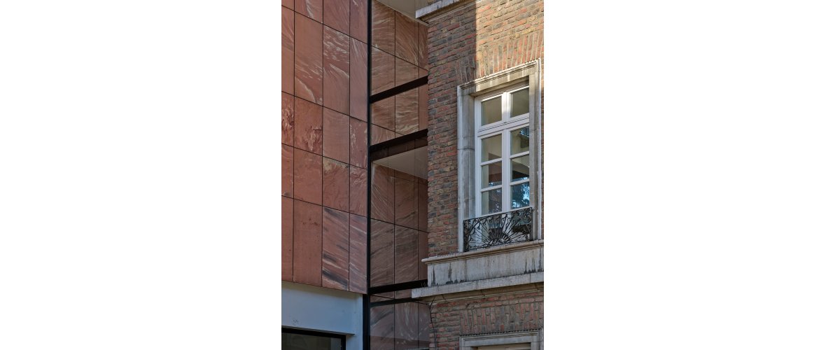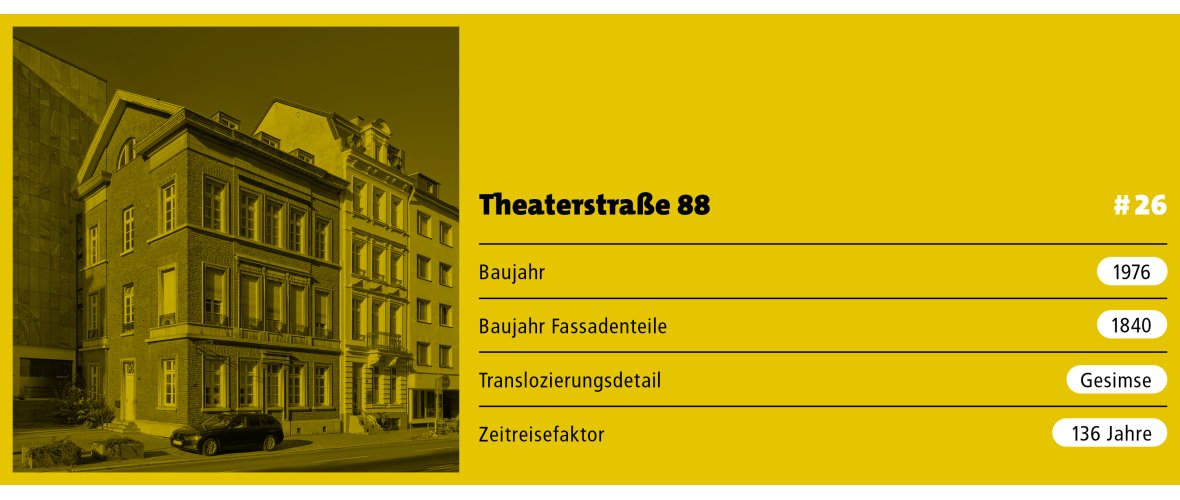 Na drie jaar op de bouwplaats te hebben gestaan, werden de geveldelen voor de nieuwbouw op de plek van nr. 88 geplaatst. De verhoudingen en structuur van de gevel zijn gebaseerd op het oorspronkelijke gebouw en komen grotendeels overeen met het origineel. De eerder bestaande gepleisterde vlakken werden weggelaten. De deuren die eerder dichtgemetseld waren, werden ook op dezelfde manier herbouwd. Nieuw is echter de driehoekige gevel naar de Vereinsstraße en de aanzienlijk sterkere dakrand en gevel kroonlijst.