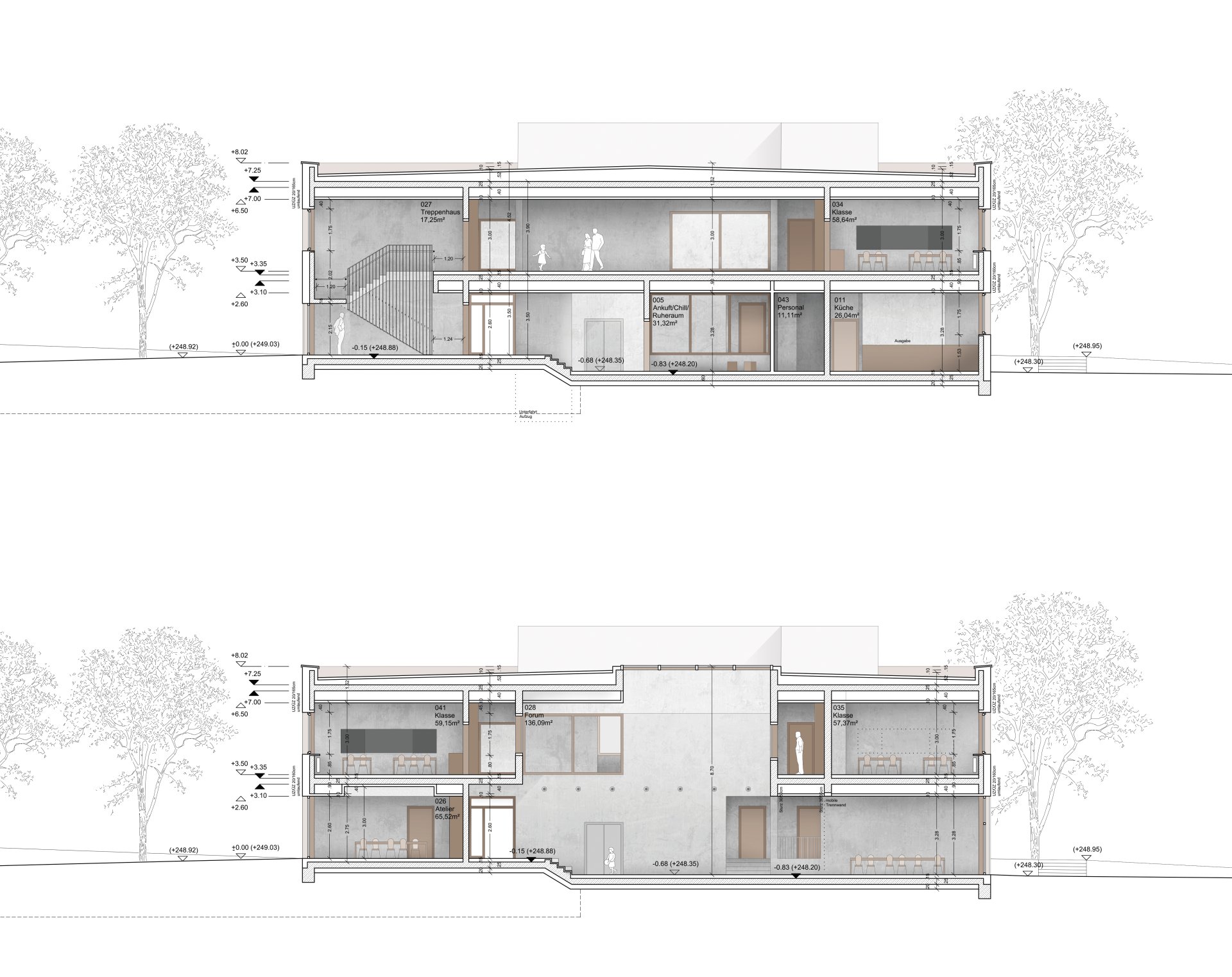 Samen met het bestaande kinderdagverblijf en de sporthalgebouwen en de uitgebreide buitenfaciliteiten vormt de nieuwbouw een gemeenschappelijk "onderwijslandschap" rond het centrale schoolplein. Het ruimtelijk concept van de school is de opstelling van alle ruimtes rond een centrale ruimte van twee verdiepingen die het forum wordt genoemd. Het forum is enerzijds een plek voor speciale evenementen en anderzijds een speel-, leer- en communicatieruimte. De buitenkant van het gebouw heeft een duidelijke kubusvorm op een vierkante voetafdruk. Belangrijke binnenruimtes (entree, studio, eetzaal) worden benadrukt door verdiepingshoge openingen, waardoor de verbinding met de open ruimtes wordt versterkt.