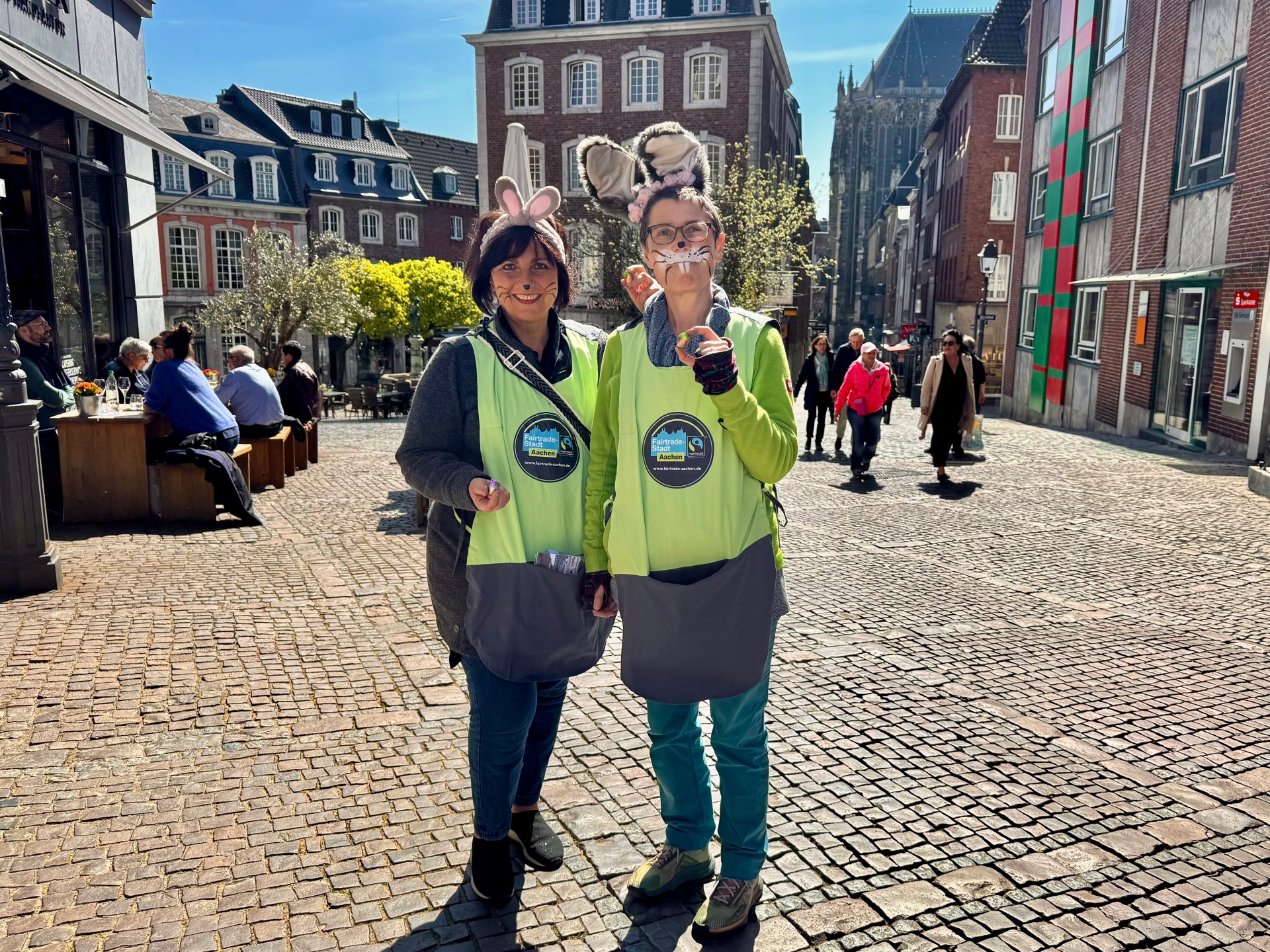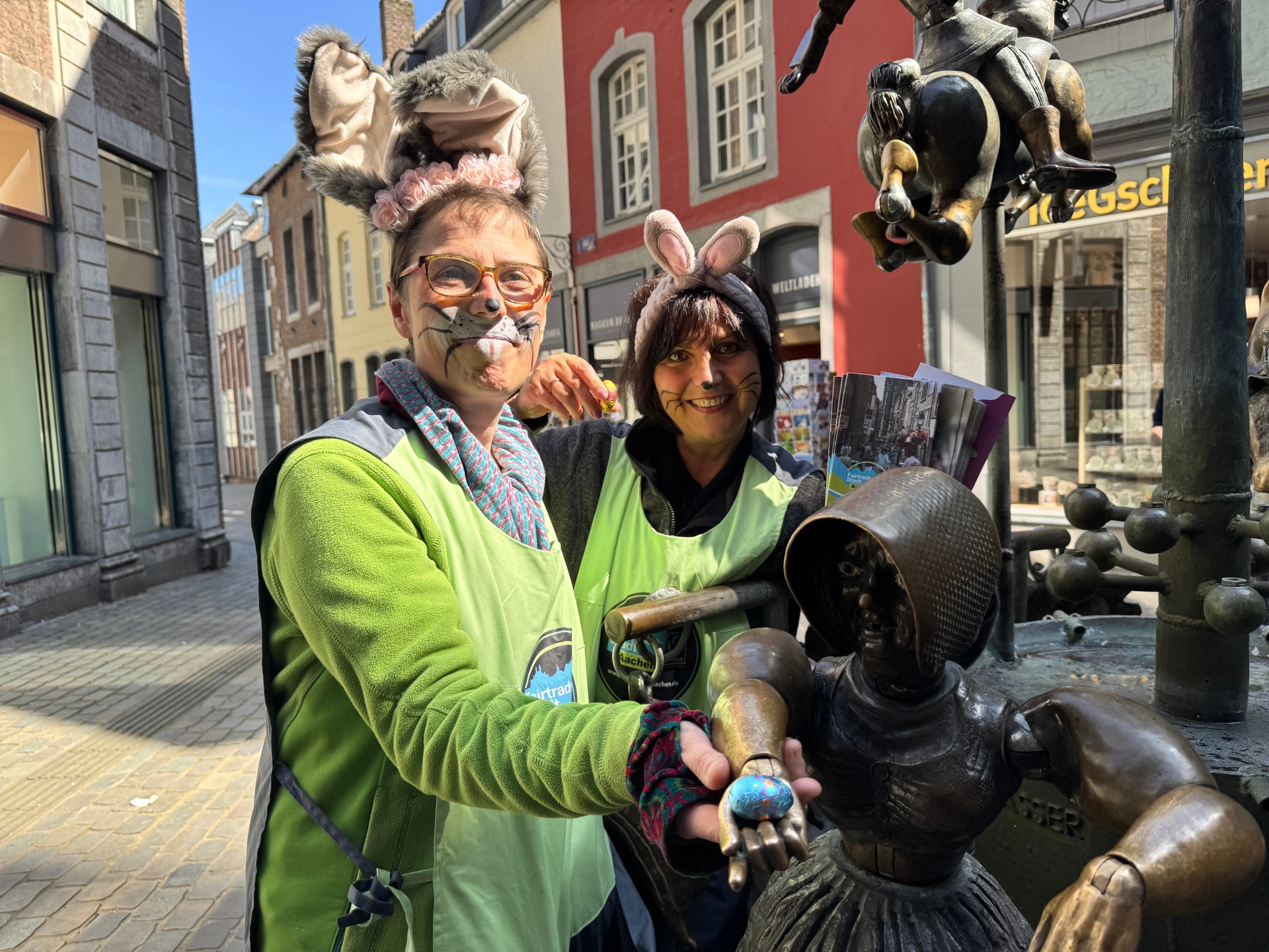 Kort voor Pasen (op vrijdag 11 april) waren twee paashazen op pad in het centrum van Aken om heerlijke chocolade-eieren uit te delen aan voorbijgangers. De specialiteit: De paaseitjes waren gemaakt van fairtrade chocolade. De paashazen zijn namelijk ook actief lid van de stuurgroep Fairtrade Stad Aken.