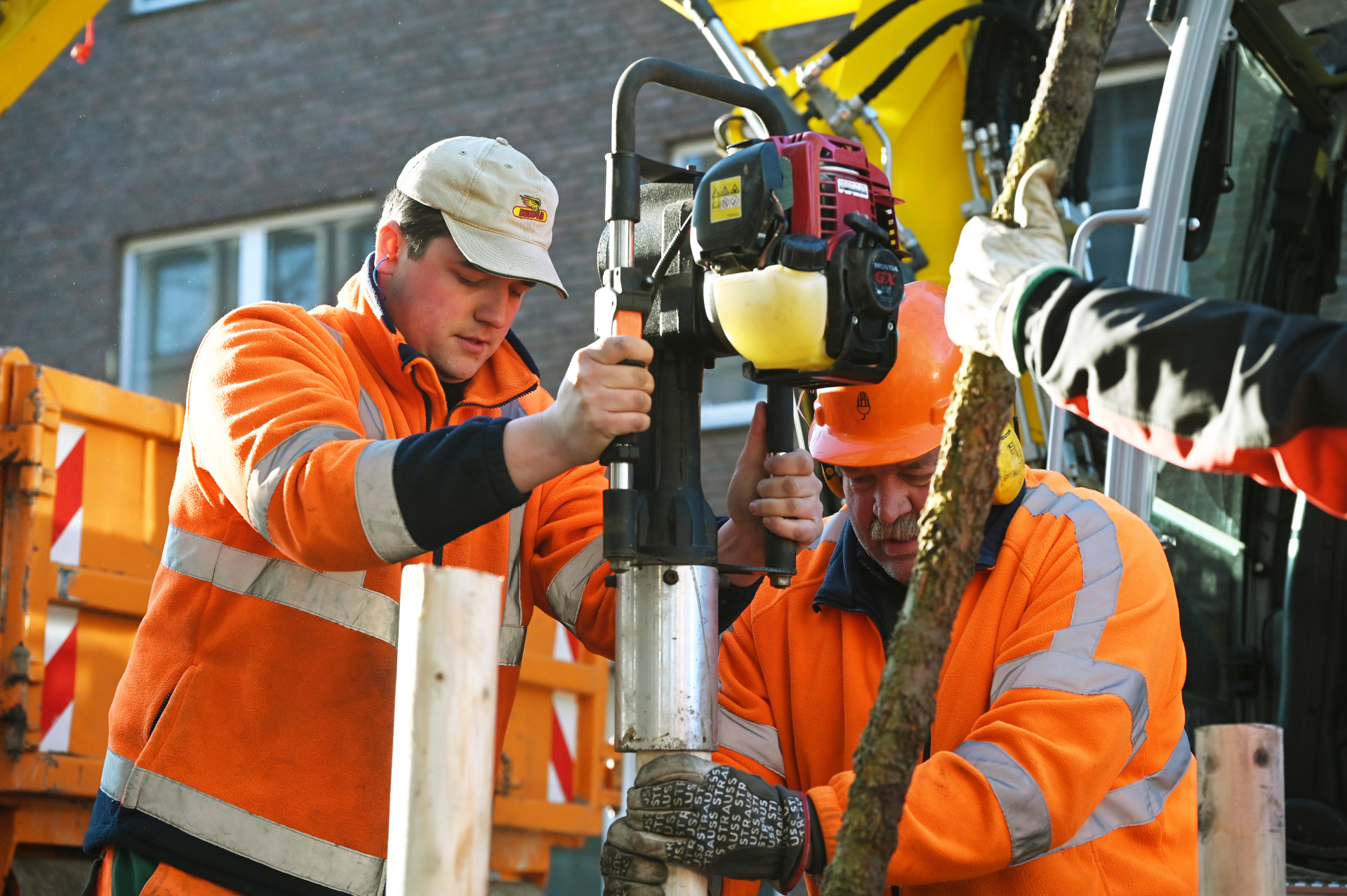 Omdat ze niet langer verkeersveilig waren, werden ze aan het begin van het project vakkundig geveld door het boomverzorgingsteam. Nu, de volgende dag, beginnen collega's de lege boomschijf klaar te maken voor herplant. De wortels worden uitgefreesd, de gebruikte grond wordt afgegraven en de randen van het terrein worden op sommige plaatsen hersteld. Extra beluchting zorgt ook voor voldoende gasuitwisseling zodat er geen wateroverlast of rotting kan ontstaan. De medewerkers van het boomplantteam voegen een bodemactivator toe aan de grond om te zorgen voor voldoende micro-organismen in de bodem. Er is ook een startmeststof nodig zodat de bomen eerst in het wortelgebied uitlopen voordat ze in de boomkroon groeien.