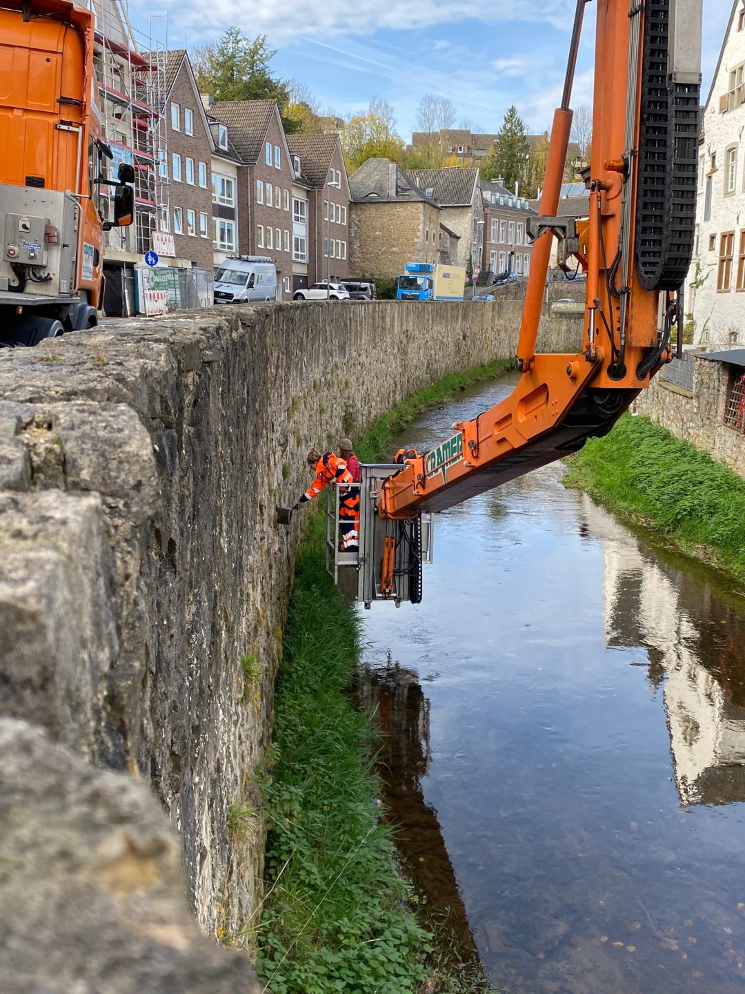 "Ook al weten we op dit moment dat de kademuur in 2026 ingrijpend zal worden gerenoveerd, toch moeten we voldoen aan onze plicht om hem te inspecteren," benadrukt Barbara Siodmok, ingenieur bij de afdeling wegenonderhoud en bruggenbouw van Aachener Stadtbetrieb. Zij begeleidt deze dag de inspectie van de historische kademuur, die wordt uitgevoerd door een ingehuurd ingenieursbureau.