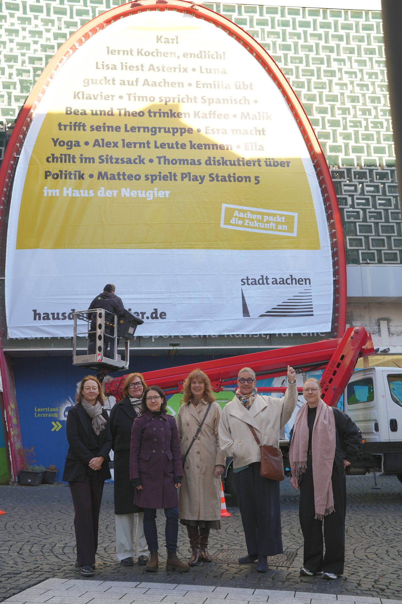 Karl leert eindelijk koken, Lisa leest Asterix, Luna kijkt naar Aken: Sinds donderdag (30 oktober) biedt het grote spandoek op het Haus der Neugier een blik in de toekomst. Want waar een warenhuis decennialang klanten trok en waar het grootste deel van de ruimte de afgelopen jaren leegstond, komt er binnenkort weer leven in het Haus der Neugier. Het 8,5 x 9,5 meter grote spandoek in de bekende zwart-gele Akense look staat symbool voor de geest van optimisme die al van verre te zien is. Burgemeester Sibylle Keupen maakte op haar voorlaatste ambtsdag van de gelegenheid gebruik om persoonlijk aanwezig te zijn bij het ophangen van het spandoek: "Met het spandoek laten we zien dat het Haus der Neugier een huis vol mogelijkheden voor de burgers van onze stad zal zijn. Ik wens de mensen die dit prachtige project nu verder gaan een goede hand en veel succes, zodat we het Haus der Neugier in 2029 kunnen openen."