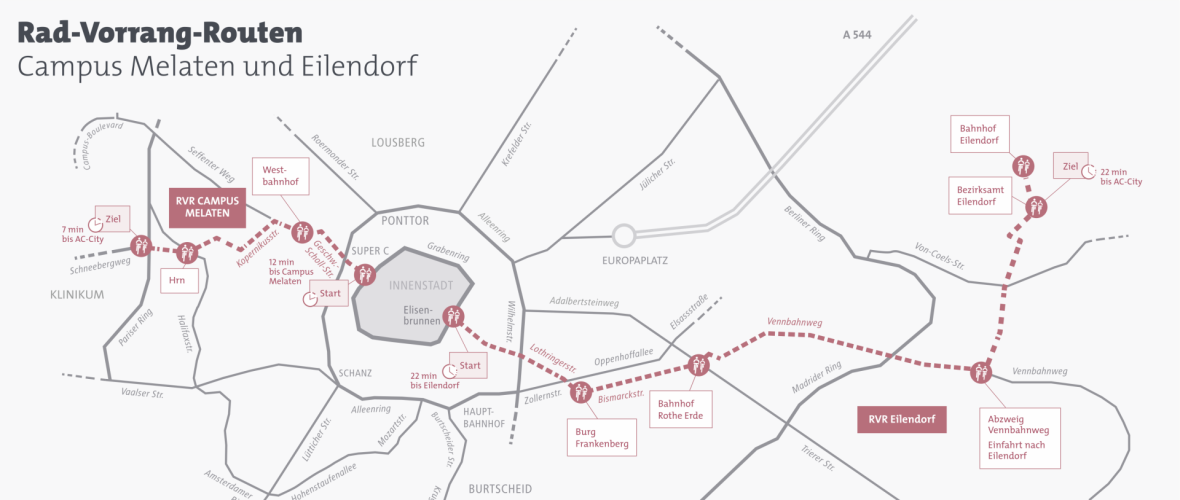 Die Rad-Vorrang-Routen Eilendorf und Campus Melaten stellen die Pilotroute des Rad-Vorrang-Netzes in Aachen dar. Für wesentliche Maßnahmen auf diesen beiden Routen und die Sichtbarmachung des Konzeptes "Rad-Vorrang-Route" wurden Fördermittel der Nationalen Klimaschutzinitiative unter dem Titel "Rad-Vorrang-Route Aachen 1" genutzt.
