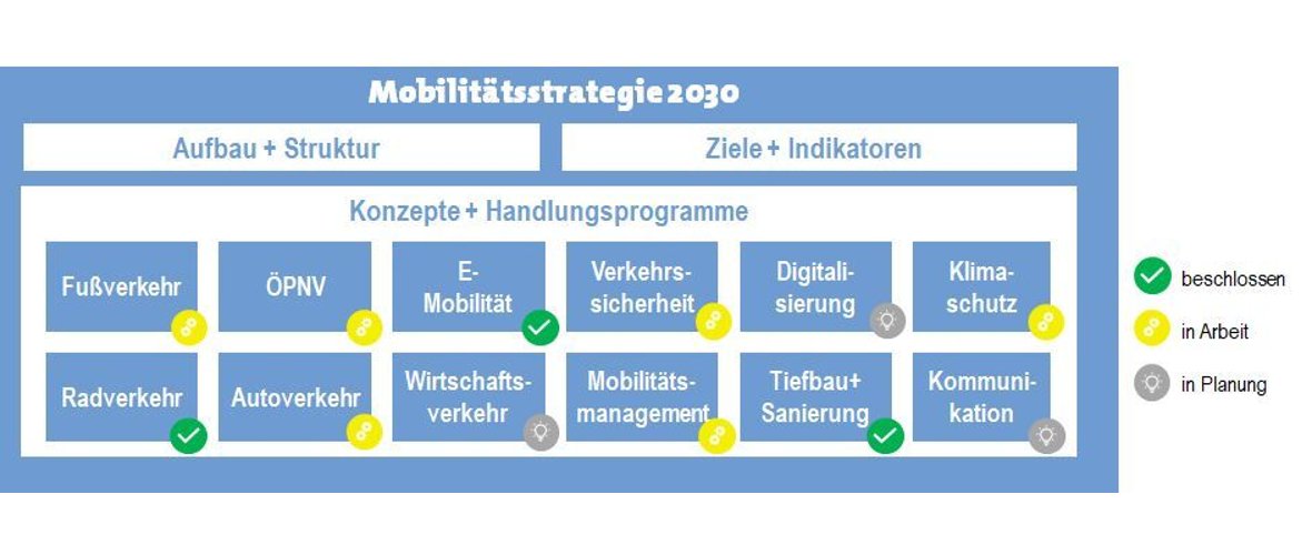 Eine Vision Mobilität 2050 wurde 2014 verabschiedet, Strukturen und Ziele der Mobilitätsstrategie 2030 wurden 2019 und 2020 beschlossen.