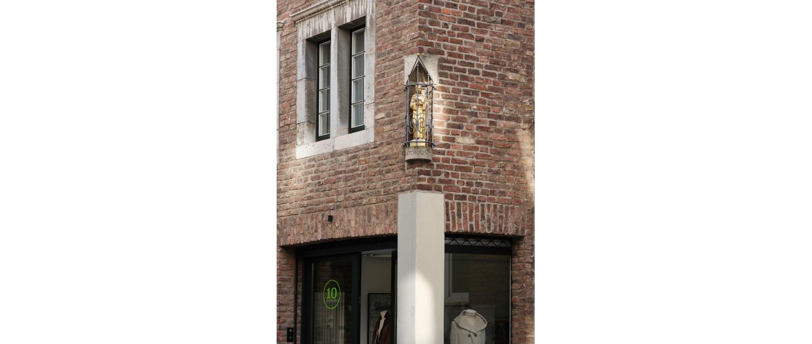 An der Ecke befindet sich die 1976 ergänzte Hausfigur des hl. Antonius. Ursprünglich besaßen nahezu alle Aachener Häuser ein Hauszeichen oder eine Hausfigur. Hier wurde also eine Tradition wieder aufgegriffen. Besonders schön gestaltet ist das hölzerne Traufgesims mit Klötzchenfries, das dem des Vorgängerbaus exakt nachempfunden wurde.