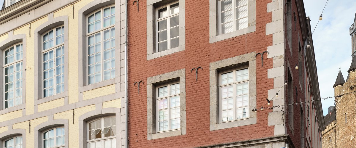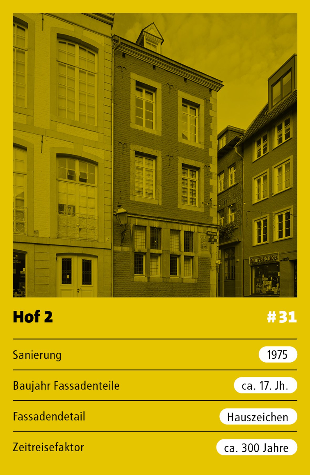 Das Haus Hof 2 ist kein klassischer Wiederaufbau und auch kein Lückenfüller. Stattdessen wurde hier vor allem das Erdgeschoss eines Bestandsgebäudes in einen vermeintlich historischen Zustand zurückgeführt. Seit 1961 gehört das Haus zum Aachener Couven-Museum.