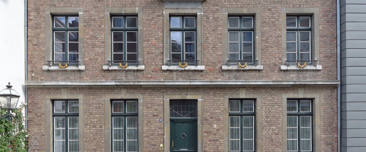 Das Haus Hof Nr. 9 liegt direkt neben dem früheren Quirinusbad (Nr. 7). Der damalige Stadtkonservator Leo Hugot wählte in den 1960er Jahren die hier bestehende Baulücke als Standort für sein zukünftiges Wohnhaus und Architekturbüro und leitete die Neubaumaßnahmen selbst.