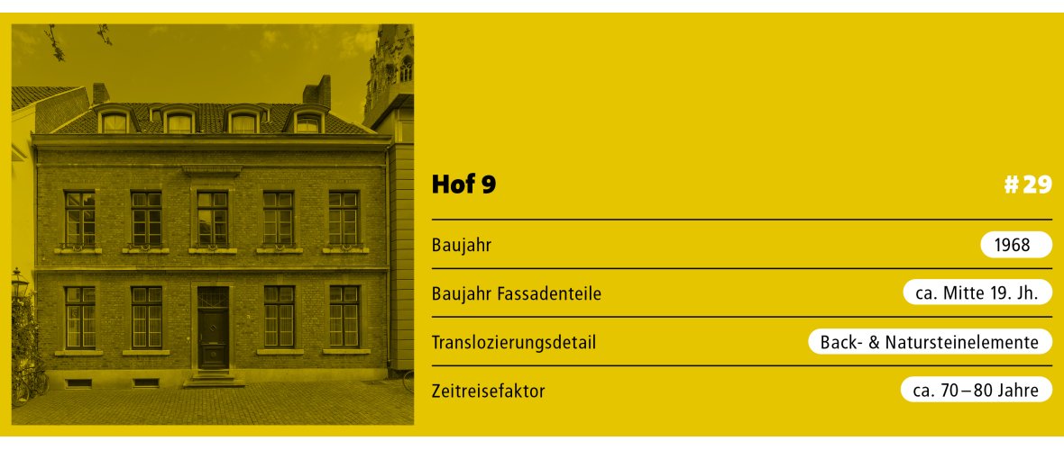 Das Haus Hof Nr. 9 liegt direkt neben dem früheren Quirinusbad (Nr. 7). Der damalige Stadtkonservator Leo Hugot wählte in den 1960er Jahren die hier bestehende Baulücke als Standort für sein zukünftiges Wohnhaus und Architekturbüro und leitete die Neubaumaßnahmen selbst.