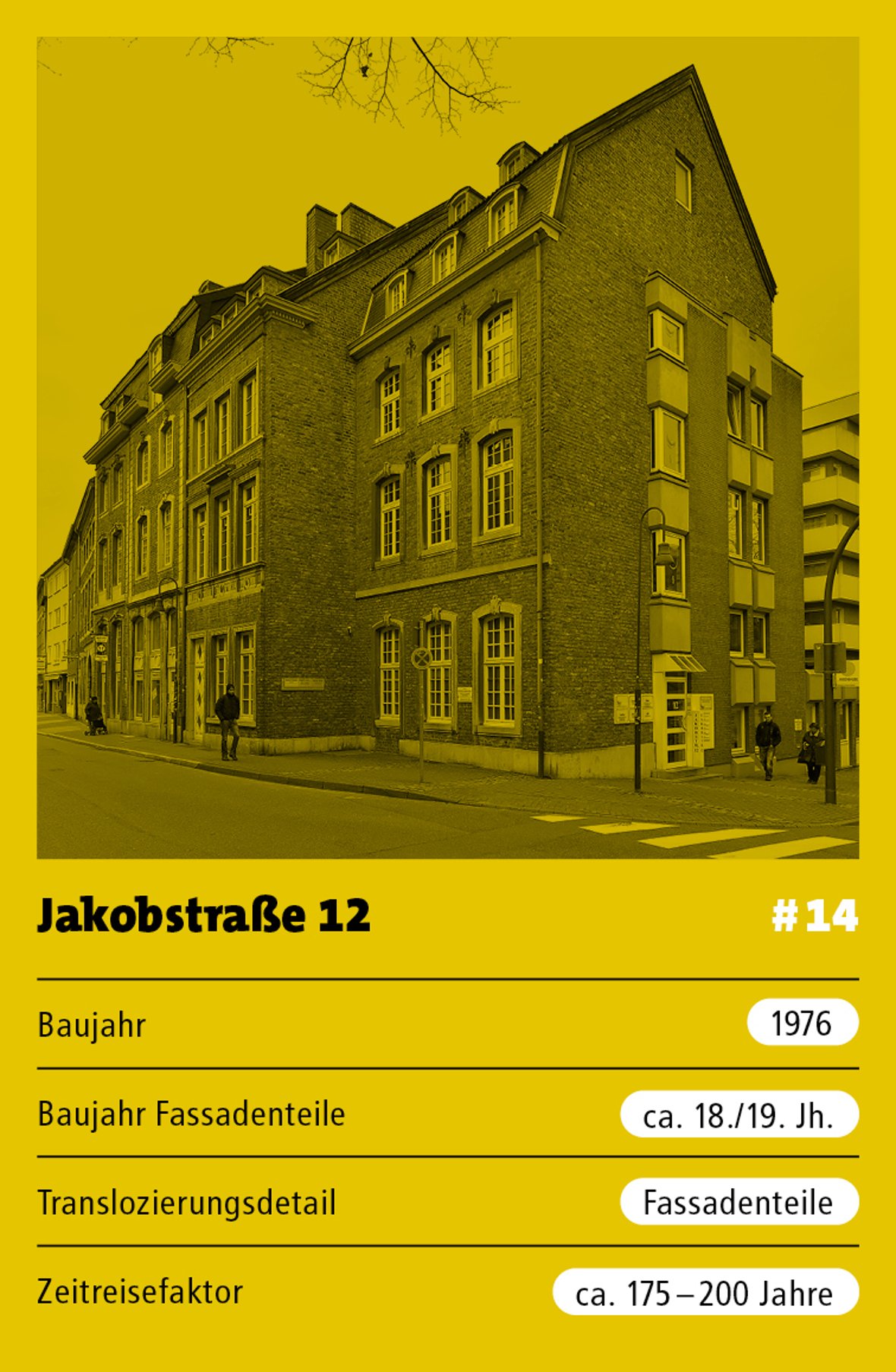 Das Eckhaus Jakobstraße 12 fügt sich ein in die Reihe der historisierenden Neubauten im ehemaligen Sanierungsgebiet der Jakobstraße. Die Vorgängerbebauung wurde in den 1970er Jahren abgerissen, neu errichtet und dabei mit historischen Fassadenelementen abgetragener Gebäude ausgestattet.