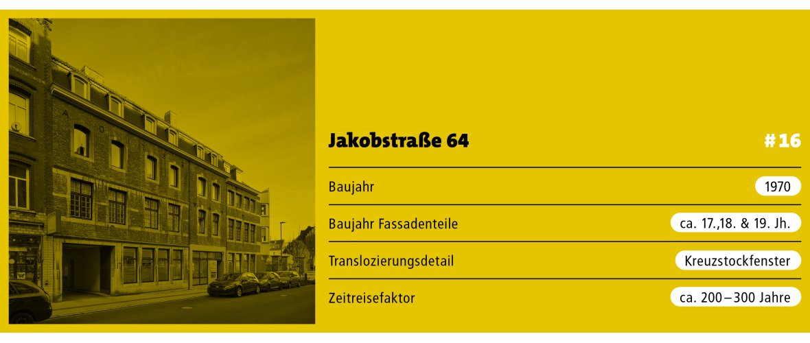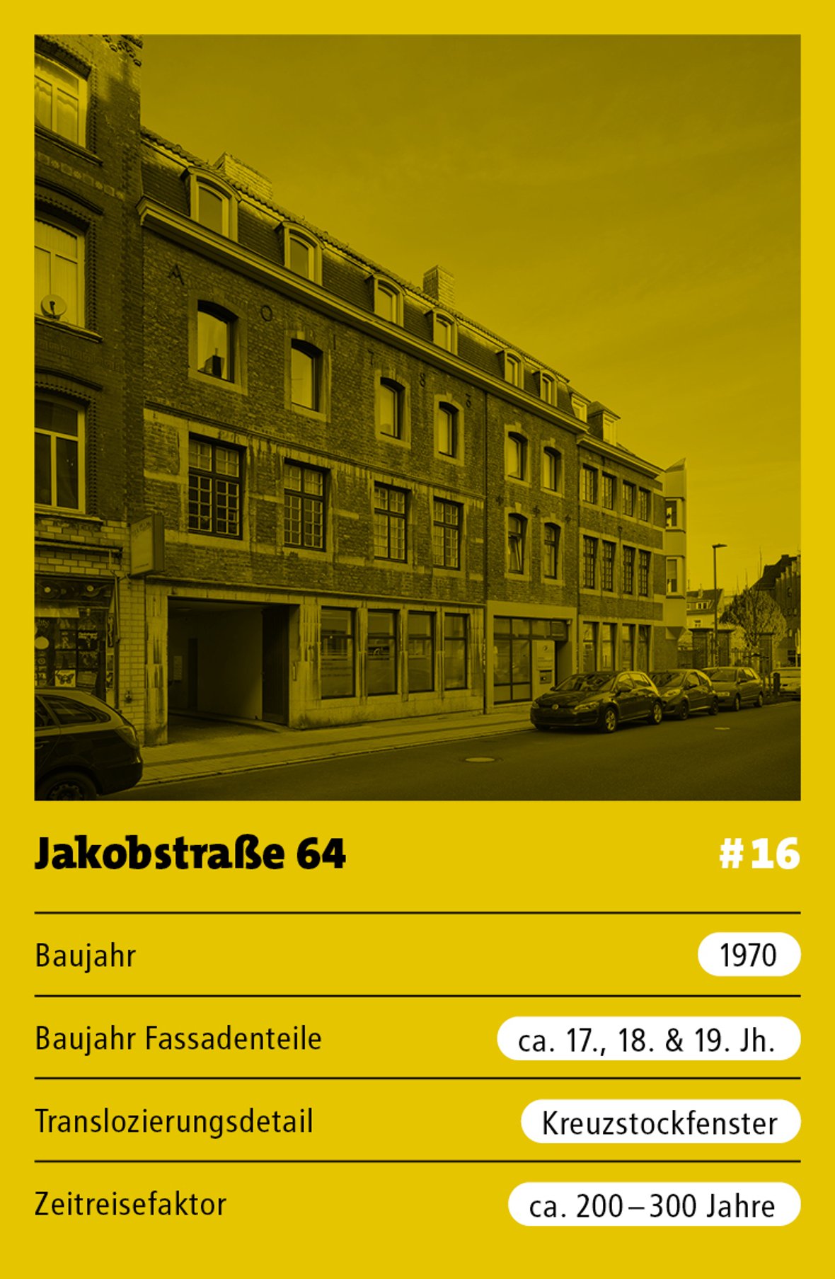Bei den Bauarbeiten wurde der Neubaukomplex um eine Parzelle nach links versetzt (aufgrund einer Baulücke) und die Fluchtlinie zurückversetzt. So konnte auch die Verbreiterung der Jakobstraße zugunsten des modernen Verkehrs umgesetzt werden. Die Reihung der Fassaden ergibt sich im Neubau wie folgt: Dass die linke Fassade aus den unterschiedlich zu datierenden Häusern Nr. 62 und Nr. 64 zusammengefügt wurde, erkennt man an den Kreuzstockfenstern des ersten Obergeschosses (typisch für das 17. Jh.) und den Fenstern mit Segmentbogen im zweiten Obergeschoss (typisch 18./19. Jh.). Mittig folgt die ehemalige Nr. 50, gekürzt um eine Fensterachse. Der rechte Teil wird gebildet aus den ehemaligen Fassaden von Nr. 52 und Nr. 54. Alle historischen Fassaden wurden im Erdgeschoss komplett neugestaltet. Dafür wurden größtenteils neue Materialien verwendet. Rückseitig und vor allem an der Ecke ist das Gebäude mit Betonelementen im Stil der 1970er Jahre gestaltet. Diese Kombination von historischen und modernen Elementen ist gerade im Bereich Jakobstraße/Kockerellstraße ein mit Absicht oft gewähltes Stilmittel.