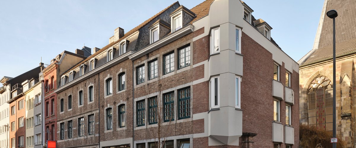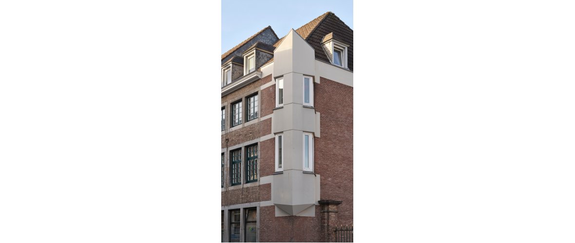 Der heutige langgestreckte Baukörper mit der Hausnummer 64 wurde 1970 unter Leitung von Stadtkonservator Leo Hugot errichtet. Ein bunt gemischtes Fassaden-Potpourri von fünf verschiedenen historischen Häusern ist dem Neubau vorgeblendet worden.
