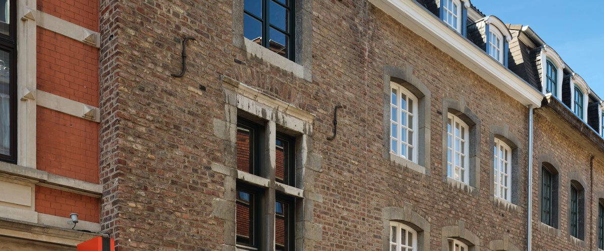 Bei den Fassaden wurden unterschiedliche Konzepte – Rekonstruktion und Arrangement – angewandt: Teile der linken Fassade wurden rekonstruiert, d. h., es wurden Details möglichst originalgetreu wiederhergestellt. Rechts wurden Blausteinelemente verschiedener Herkunft zu einer strengen, gleichmäßigen Fassade neu arrangiert.