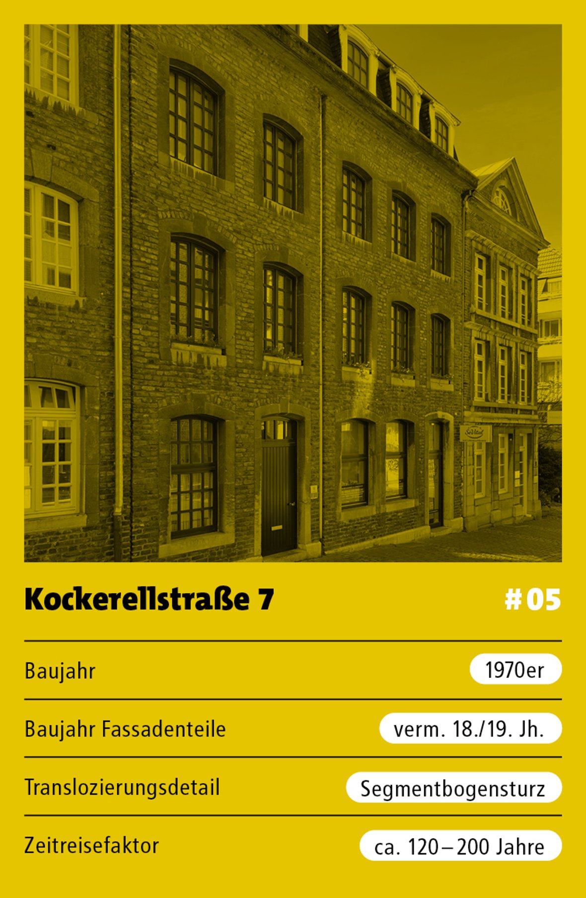 Das Haus Kockerellstraße 7 wurde in den 1970er Jahren erbaut. Die Fassadenteile stammen vermutlich aus dem 18.–19. Jahrhundert. Ein wichtiges Translozierungsdetail ist der Segmentbogensturz. Der Zeitreisefaktor des Denkmals liegt bei ca. 120–200 Jahren.