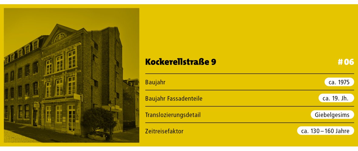 Zur Kockerellstraße wurde die vollständig translozierte Fassade des Hauses Peterstraße 47 mit nur wenigen Veränderungen im Sockel wiedererrichtet. Da es sich eigentlich um eine Reihenhausfassade mit beidseitigem Anschluss weiterer Fassaden handelte, musste nun beim Neuaufbau als Eckgebäude eine ansprechende Lösung gesucht werden. Dazu wurde das profilierte Giebelgesims ein Stück weit um die Ecke gezogen und die Backsteinwand etwas verbreitert, wodurch die Fassade eine leichte Asymmetrie erhielt.