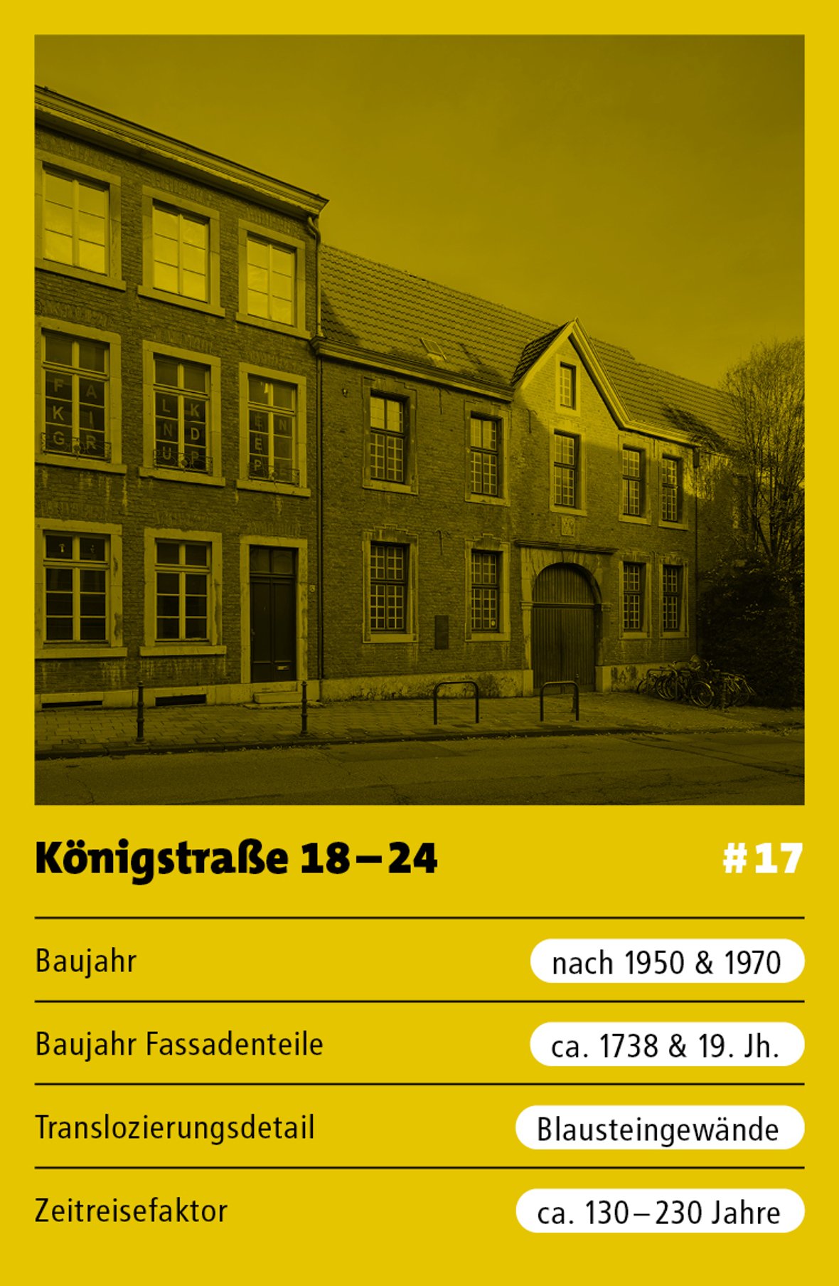 Das durch Giebel und Toreinfahrt auffallende Haus Königstraße Nr. 18–22 wird dem Aachener Barockbaumeister Laurenz Mefferdatis zugeschrieben. 1738 errichtet, wurde das Gebäude im Zweiten Weltkrieg stark beschädigt. Für den Neubau einer Schulturnhalle entschloss sich das Hochbauamt der Stadt Aachen, die Fassadenreste abzutragen und als Rekonstruktion in den Neubau zu integrieren. Anders als bei der Wespienfassade (Kockerellstr.) ist der Turnhallenneubau hier straßenseitig vollkommen verdeckt.