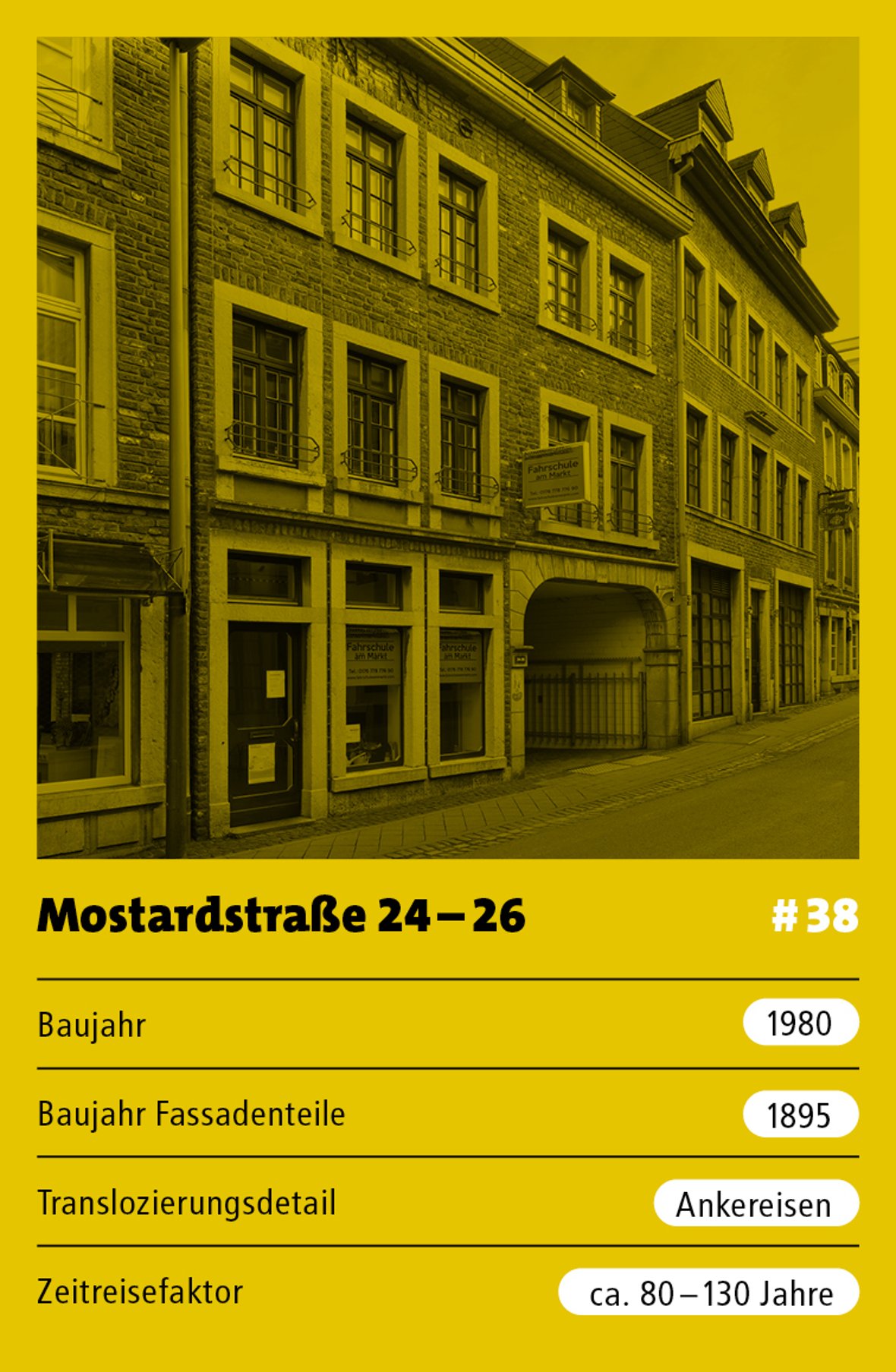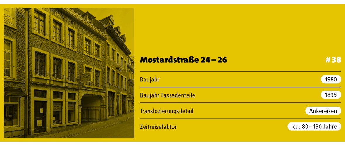 Unter der Adresse Mostardstraße 24–26 findet man zwei typische Aachener Backsteingebäude aus dem 19. Jahrhundert. Doch weder sind es zwei Gebäude, noch sind die Fassaden wirklich historisch. Was ist hier passiert?