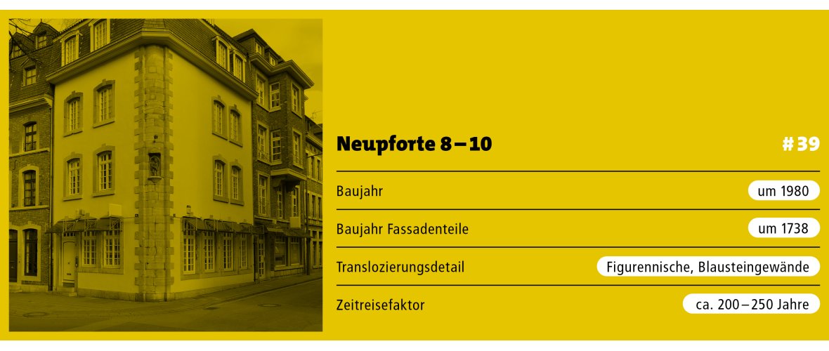 Das Gebiet um Neupforte und Mostardstraße gehörte zum Sanierungsgebiet III. Schon ab 1968 begann die Stadt, Häuser in diesem Bereich aufzukaufen und vorbereitend zu vermauern, nicht zuletzt um Hausbesetzungen zu vermeiden. Neben der Schaffung neuen Wohnraumes sollte auch die Straße mit neuen Baufluchten verbreitert werden. Als man unter Leo Hugot auch daranging, die alten Häuser der rechten Seite abzubrechen und zu ersetzen, bildete sich eine Bürgerinitiative. Trotz des Widerspruchs begannen 1975 die Sanierungsarbeiten im Viertel. Im Jahr 1980 wurden dann auch die beiden Häuser Neupforte 8 und 10 durch den Architekten Kurt Nellessen fertiggestellt.