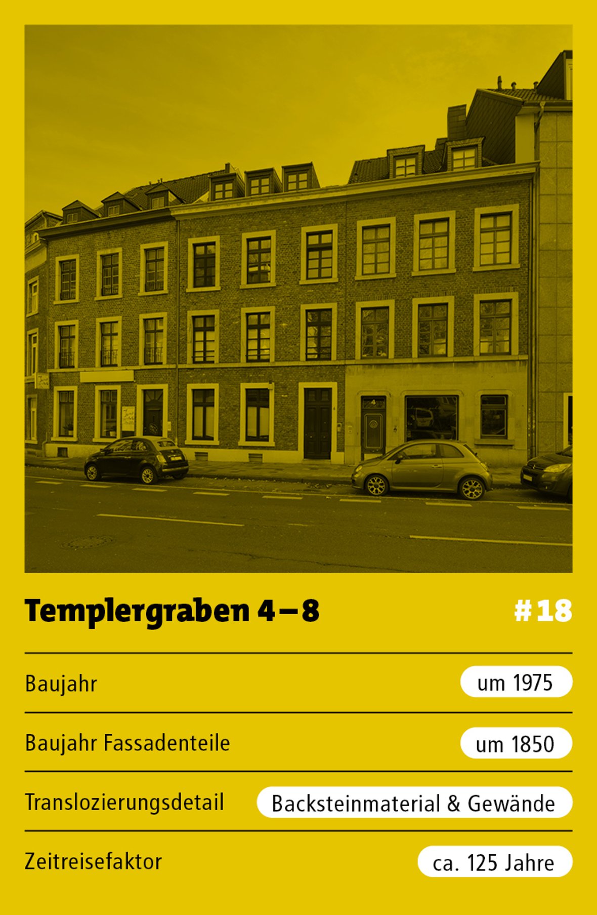 Der Templergraben als Teil der ringförmigen Verkehrsführung um die Altstadt wies hier eine Engstelle auf, die für den wachsenden Verkehr der Nachkriegszeit vor allem im Zusammenhang mit der benachbarten Universität einer Verbesserung bedurfte. Dazu sollten die drei Gebäude Templergraben 4, 6 und 8 Mitte der 1970er Jahre abgerissen werden. Der Landeskonservator bestand jedoch darauf, die Fassaden zu erhalten. Erfahrung im Wiederaufbau historischer Fassaden besaß man in Aachen zur Genüge, so dass die Gebäude abgerissen und die Fassadenteile beim Wiederaufbau wiederverwendet wurden.