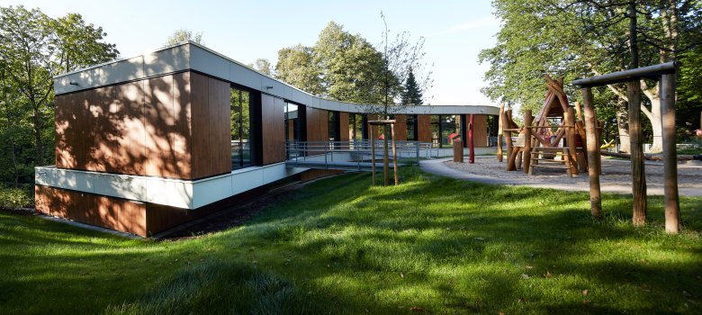 Diese Kita wird nahezu klimaneutral gebaut und betrieben. Zur Nachhaltigkeit tragen zudem begrünte Schrägdächer, Photovoltaikanlagen und die Minimierung versiegelter Flächen auf dem Grundstück bei.