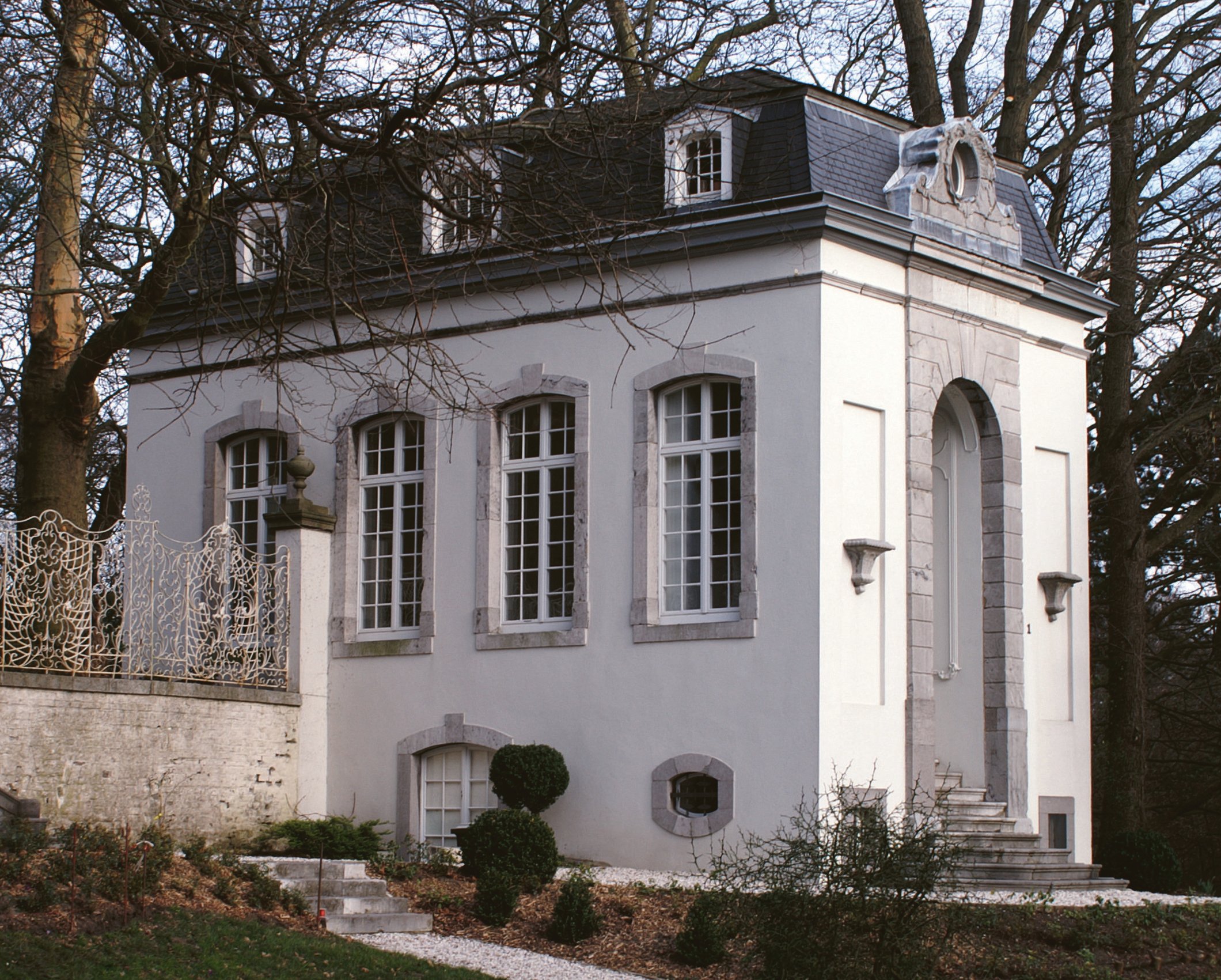 Der Kerstensche Pavillon ist ein Zeitzeugnis des Spätbarocks von Johann-Joseph Couven, 1737 für den Färbermeister Mantels am Annuntiatenbach gebaut, von dort 1907 transloziert auf den Lousberg.