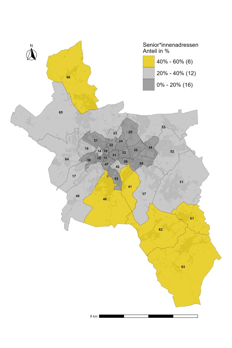 Im Durchschnitt leben in Aachen 28;5 Prozent der Senior*innen an Adressen, die ausschließlich von Senior*innen bewohnt werden. Auf der untenstehenden Karte werden diese Anteile für die Statistischen Bezirke dargestellt. In den Bezirken Panneschopp (1,5 Prozent), Frankenberg (2,9 Prozent) und Marschiertor (3,5 Prozent) leben die wenigsten Senior*innen in ausschließlich von Senior*innen bewohnten Adressen. In diesen Bezirken lebt der Großteil der Senior*innen mit jüngeren Personen in einem Haus zusammen. Die Bezirke mit dem höchsten Anteil von Senior*innen in Senior*innenadressen sind Beverau (58,8 Prozent), Wahlheim (53,3 Prozent) und Richterich (51,5 Prozent).