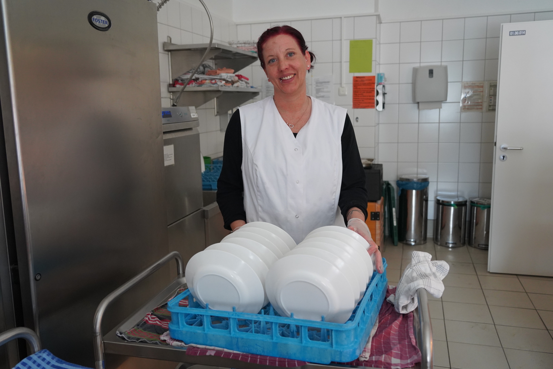 Ein weiteres Beispiel: Jennifer*, von allen Jenny genannt. Die alleinerziehende Mutter arbeitet seit August 2024 als Küchenhilfe. Die Mensen der Offenen Ganztagsschule am Lousberg (OGS am Lousberg) sind ihr Arbeitsplatz. Auch wenn sie noch am Anfang der Förderperiode steht, ist für sie schon jetzt klar, dass sie am liebsten in der OGS am Lousberg bleiben möchte. Jennys tatkräftige Unterstützung wird auf jeden Fall benötigt. Jeden Mittag bekommen etwa 220 Kinder an der Schule ein warmes Mittagessen. Ab 11 Uhr steht Jenny in der Küche; bei der Essensausgabe kennt sie die Kinder mittlerweile alle. Sie weiß, wer vegetarisches Essen bekommt, wer keine Pilze mag und wer sich besonders auf die Nudeln freut. Der Kontakt zu den Kindern macht ihre Arbeit besonders. Sie ist nicht nur Küchenhilfe, Jenny ist wie ihre Kolleginnen Bezugsperson für die Grundschulkinder. Welche Gerichte in einer Grundschulmensa am besten laufen, weiß Jenny natürlich und gestaltet daher mittlerweile auch den Essensplan mit. Die Antwort ist übrigens: „Pizza und Kartoffelpüree!“