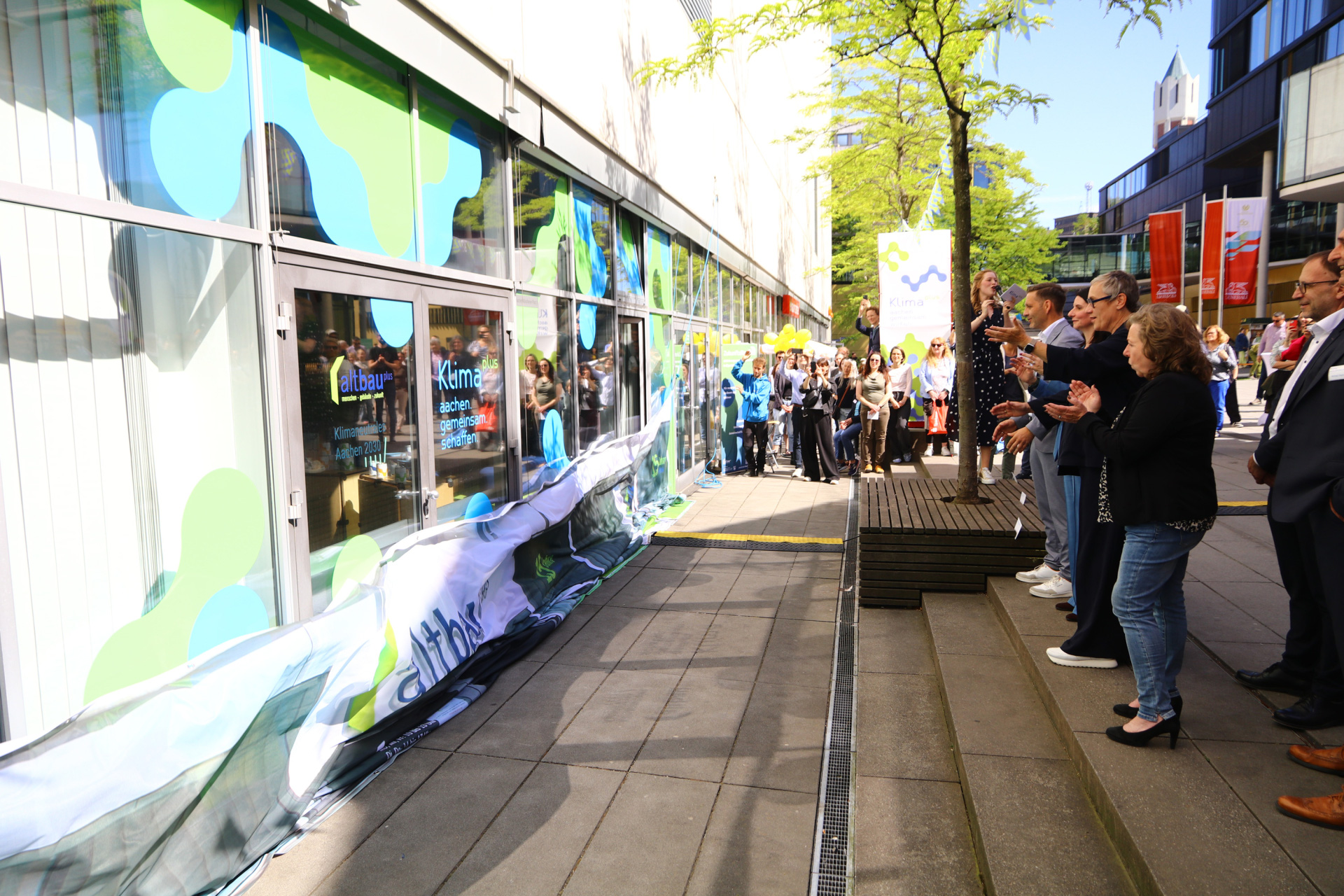 Mit einer feierlichen Enthüllung und einem vielseitigen Programm ist die neue Beratungsstelle „Klima plus“ am AachenMünchener-Platz 5 am Freitagnachmittag eröffnet worden. Klima plus lädt ab sofort als interaktiver Anlaufpunkt Bürger*innen, Unternehmen und Initiativen, die selbst aktiv werden möchten, dazu ein, sich über konkrete Klimaschutzmaßnahmen zu informieren.
