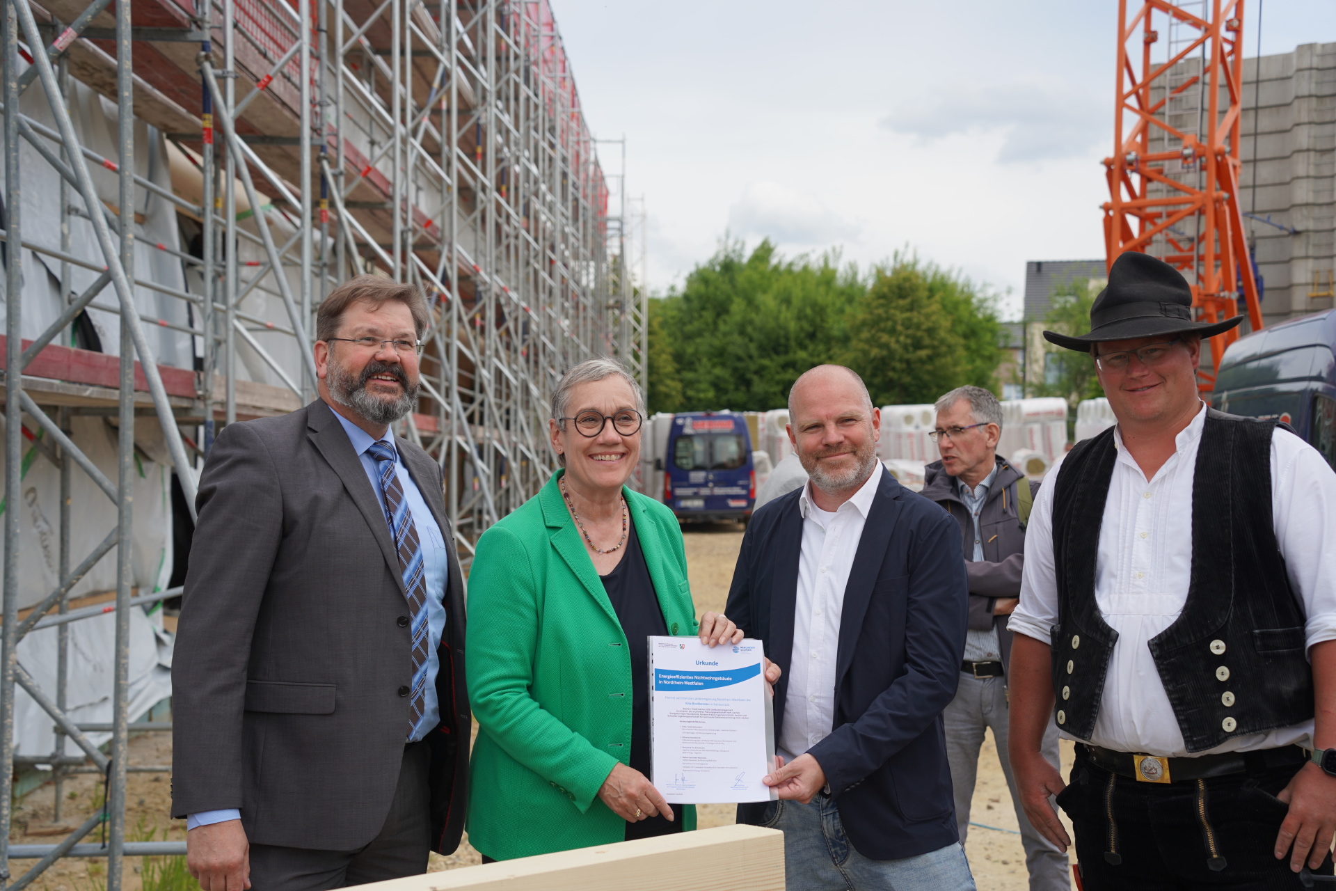 Bereits im April gab es für die Stadt Aachen Grund zum Feiern: Die KiTa Breitbenden wurde als eines von sieben Projekten vom Wirtschafts- und Klimaschutzministerium des Landes NRW als „Energieeffiziente Nichtwohngebäude in NRW" ausgezeichnet und als nachahmbares Vorbild gewürdigt. Ein zweites städtisches Projekt, die bereits fertiggestellte Kindertagesstätte Stettiner Straße, wurde ebenfalls gewürdigt. Jens Hauschild, kaufmännischer Geschäftsführer des städtischen Gebäudemanagements, konnte beim Richtfest gemeinsam mit der Oberbürgermeisterin die Urkunde an Christoph Salentin vom Planungsbüro „pbs architekten“ als Projektbeteiligter überreichen.